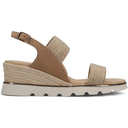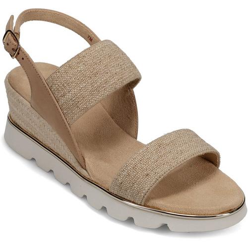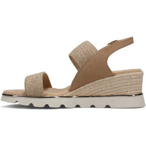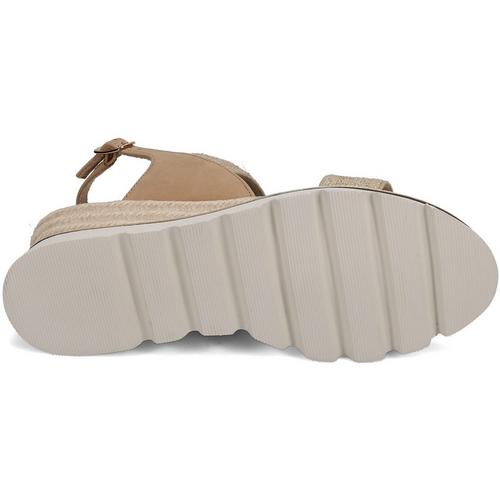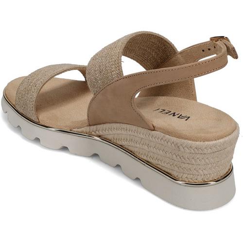Stretch knit wedge sandal. Buckle strap with hidden elastic insert. Padded footbed. Metal welt. Rope-covered wedge. Rubber sole. 2¼” total height.
