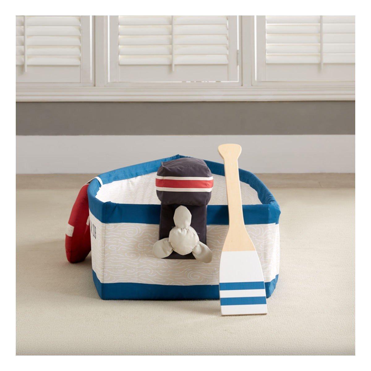 By the sea?? Not with our Gone Fishing Boat! You can be by the playroom, by the bedroom, or by any room with our fun canvas boat that includes plush motor, wooden oar and plush life preserver for “man overboard”. And rowing your boat is so easy to sit in, with a soft poly filled bottom that is cushy for the tushy! Add our Gone Fishing Accessories Set to make it a deep sea fishing adventure. Simple assembly. Ahoy Mateys!