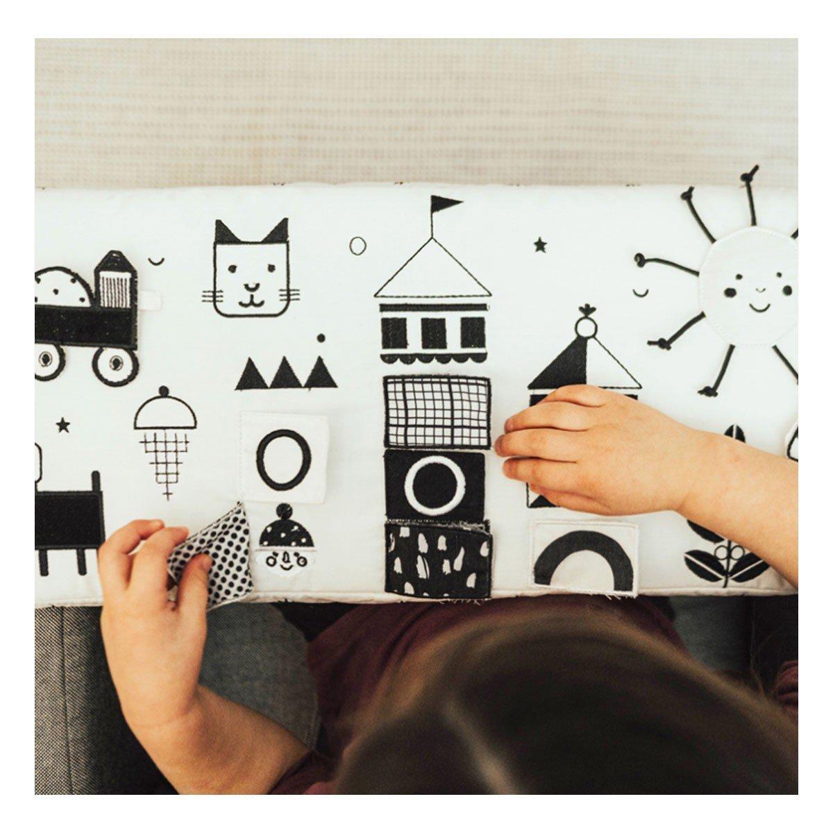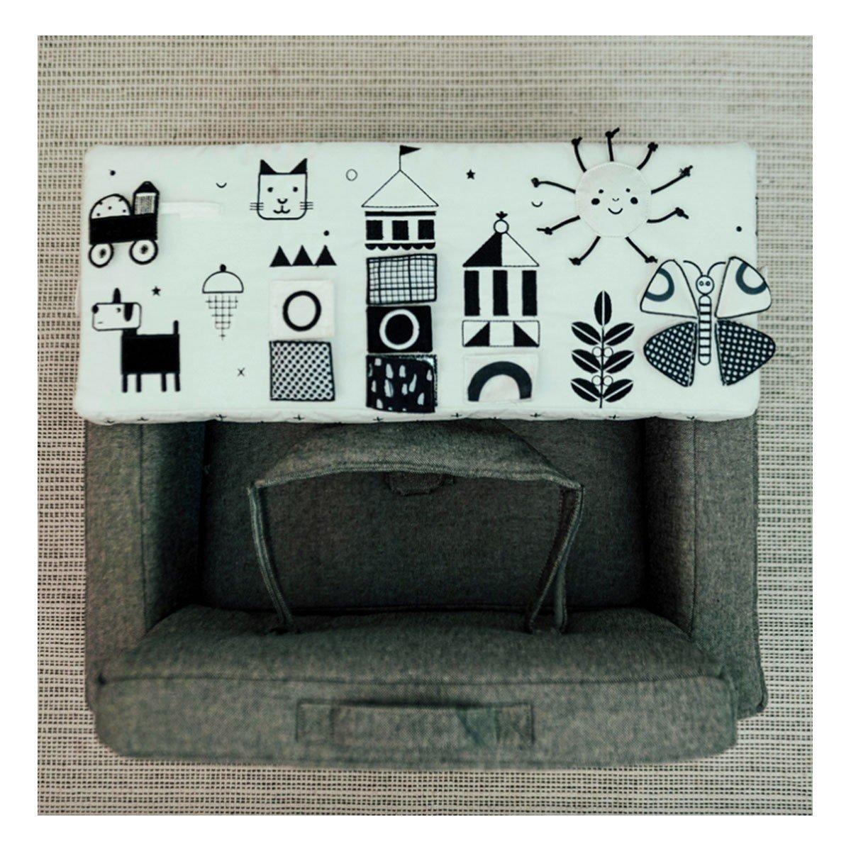 It’s hip to be a square…chair, that is. Our Happy Days Square Chair is the perfect place for baby to hang out (when they are able to sit up by themselves) and play with all of the interactive toys on the tray. They will delight in the sounds of the crinkle, peek-a-boo flap, squeakers, and movable characters, and will be stimulated by the tactile properties of the materials, including embroidery and applique. Crotch restraint helps keep baby in place. When they are a bit older, remove the tray and crotch restraint, and they have their own comfy armchair! Convenient carry handle allows you to take anywhere. Black and white pattern fits into any setting. Never leave baby unattended. For use on the floor only.
