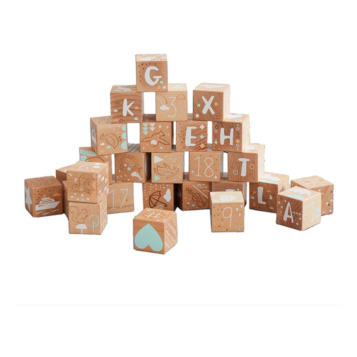 Beech wood etched blocks designed by UK artist Lizzie MacKay, designed exclusively for Asweets. 27 blocks (includes all the letters of the alphabet, numbers 1-26, and one surprise block to make a perfect square encased in a gift box ready for giving. Each block is 1.75″ x 1.75″ x 1.75″ and etched and printed with non-toxic baby safe ink. This set comes complete with unbleached printed canvas drawstring bag for storage.