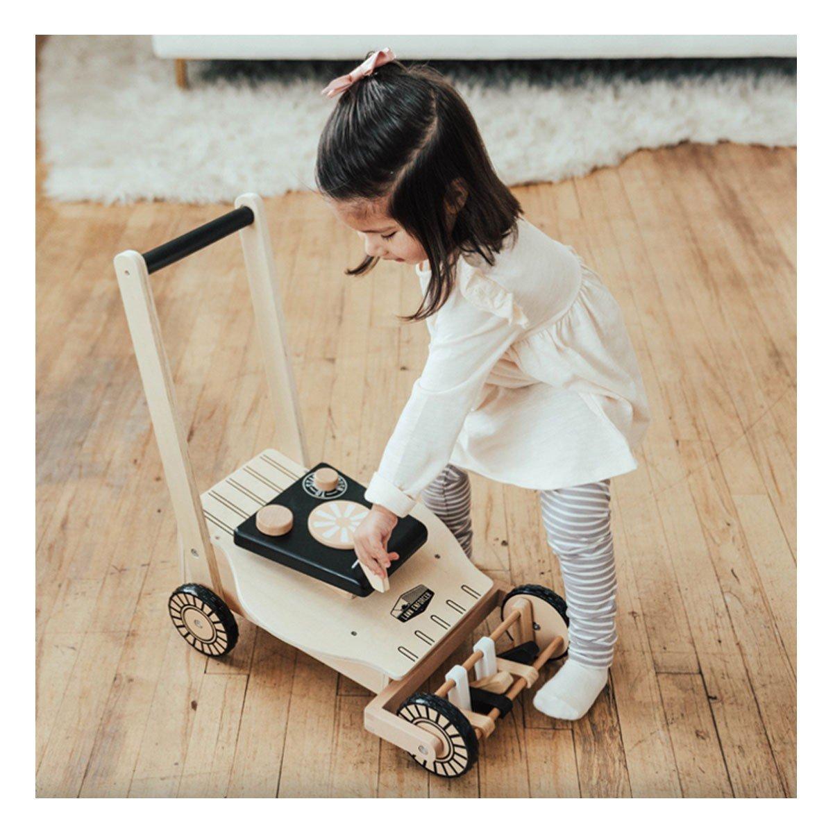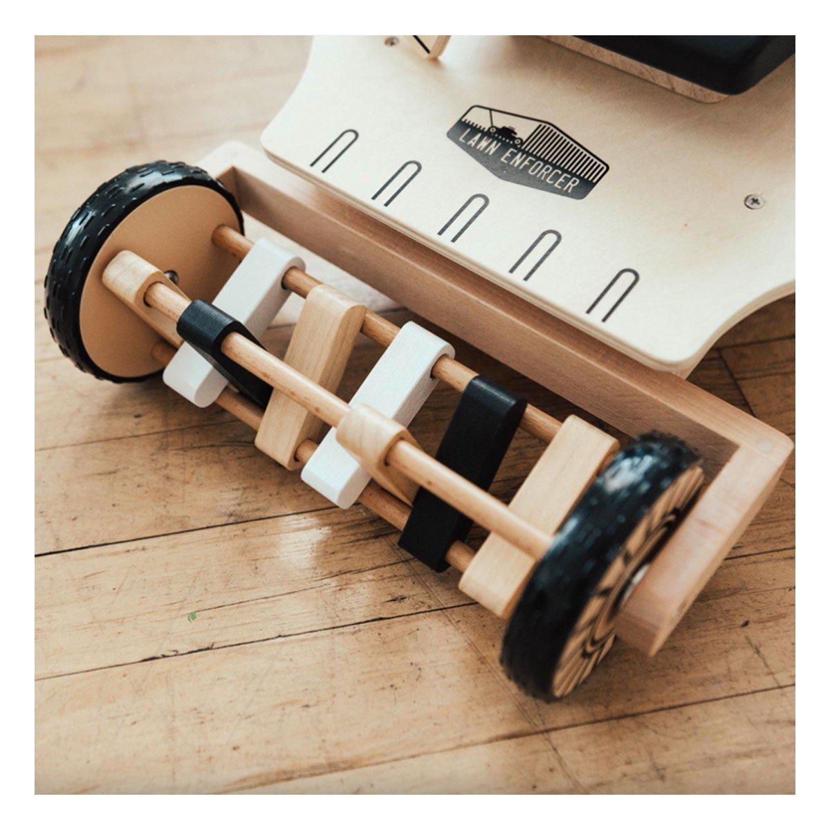 Your little landscaper will love our Lawn Enforcer! They can release the gas cap and fill with pretend gas, then pull the ripcord to start the pretend engine. Turning knobs and chunky wheels add to the charm of this fun mower. The front wheel clackers make sounds when pushed while mowing the carpet in the playroom, or the floor in the kitchen!