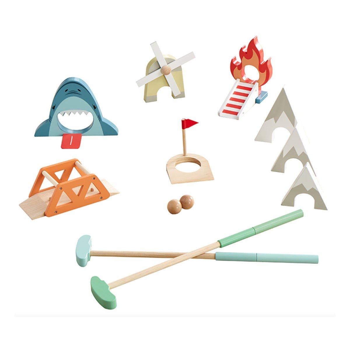 Your kiddos will love our Putt Putt Golf Set! Our 8 piece set includes shark with tongue, 3 sized mountains, flame and ramp, bridge, windmill, and hole with flag. Also includes 2 adjustable height golf clubs and 2 wooden balls. Adjust it different ways to increase or decrease difficulty level. Or pair with our Good Wood Golf Game for a big Putt Putt experience. We give it FORE stars!