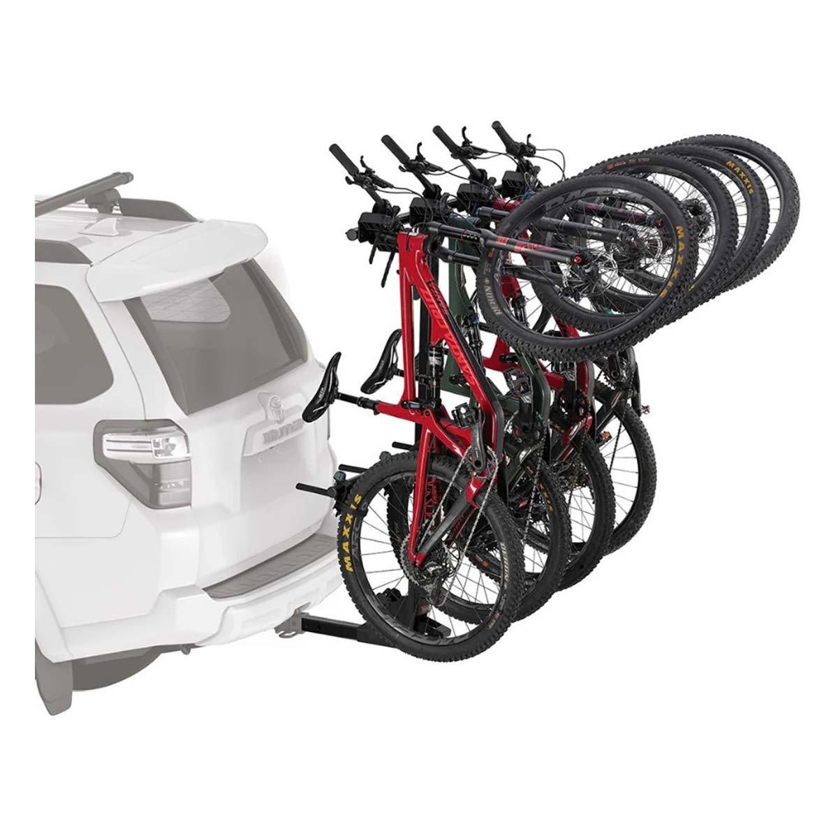 The Yakima HangTight 4 Vertical Hanging Hitch Bike Rack is designed for versatility and durability when transporting multiple bikes. With the Yakima HangTight 4, you'll need a two-inch receiver hitch in order to hang up to four bikes vertically on the back of your vehicle. Featuring the foot-operated tilt mechanism, the Yakima HangTight 4 will move away from the rear of your vehicle for easy access to the back storage without needing to remove the bike rack. To secure your bikes, this bike hitch rack features two cradles to secure each bike and prevent them from rubbing against each other during transport.