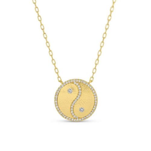 Necklace- Lightly textured Yinyang pendant with pave outline and 2 larger Cubic Zirconia on delicate paperchain, Gold