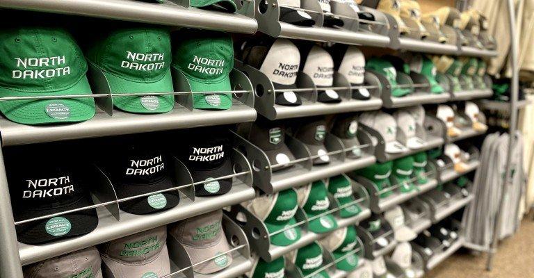 green, white, grey, and black north dakota fighting hawks hats and caps on display at grand forks scheels