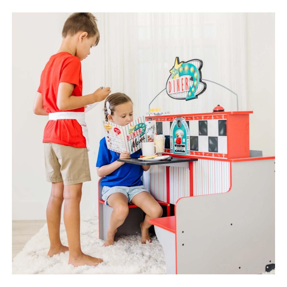 It’s twice the fun at the Star Diner! This sturdy, double-sided wooden play space lets kids cook and serve from the kitchen side, and order and enjoy a meal on the booth side. The kitchen, with an extra-large oven, realistic burners and dials, a two-shelf refrigerator, and plenty of counter space has fun details like a drink dispenser and milkshake maker with mixing rod that can be pushed up and down. At the two-seat booth, customers three and older can spin the jukebox dial to choose their favorite type of music, then drop the included coin in the slot—and the coin lands in a collection tray on the other side!