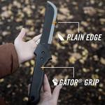 The Gator Machete sports the Gerber Gator rubber grip for ergonomic control while using either the fine edge blade on one side or the saw on the other. The riveted nylon sheath provides safe durable transport.