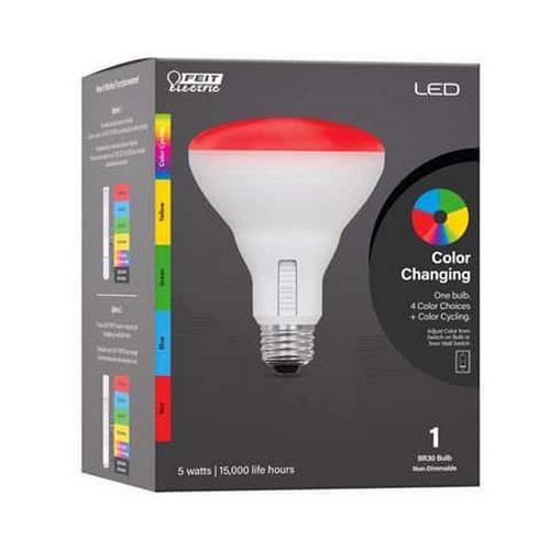 Light up your next party or special event with the Feit Electric BR30/RGBY/6WY/LEDI LED light. This versatile BR30 light emits bright color-selectable light. Six different color modes provide the perfect ambiance for weddings, parties, photoshoots, filming, and outdoor events. An integrated switch makes it easy to change colors. Simply turn the switch to cycle through red, green, blue, yellow, and color-cycling. You can also change colors by toggling a connected wall switch. This long-lasting LED light bulb uses just 5 watts of electricity - up to 92% less energy than equivalent 65-watt incandescent bulbs. It has an estimated annual cost of only $0.87. The medium E26 base fits standard household sockets. No apps or wi-fi are necessary. This bulb is damp location rated for use in bathrooms or covered patios and porches. Get fun, festive light that lasts up to 15,000 hours or 13.7 years with average 3-hour daily use.