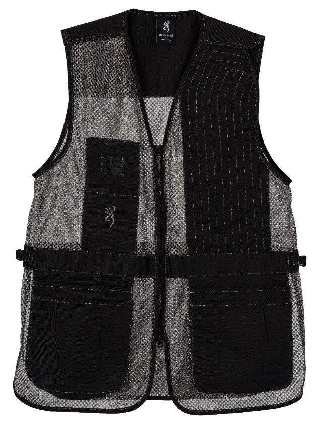 Left-hand design, lightweight breathable mesh shooting vest with a full-length shooting patch, bellows pockets for shells/gear, and a large back pocket for hulls and other gear.
