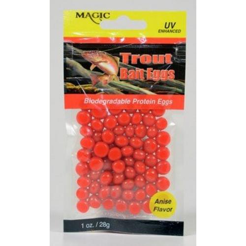 Simulated eggs made of biodegradable protein. Clean and easy to use. Stays on hook. Retains color and flavor while slowly releasing scent into water. In a recloseable 1 oz bag. Formulated for Trout Fishing.