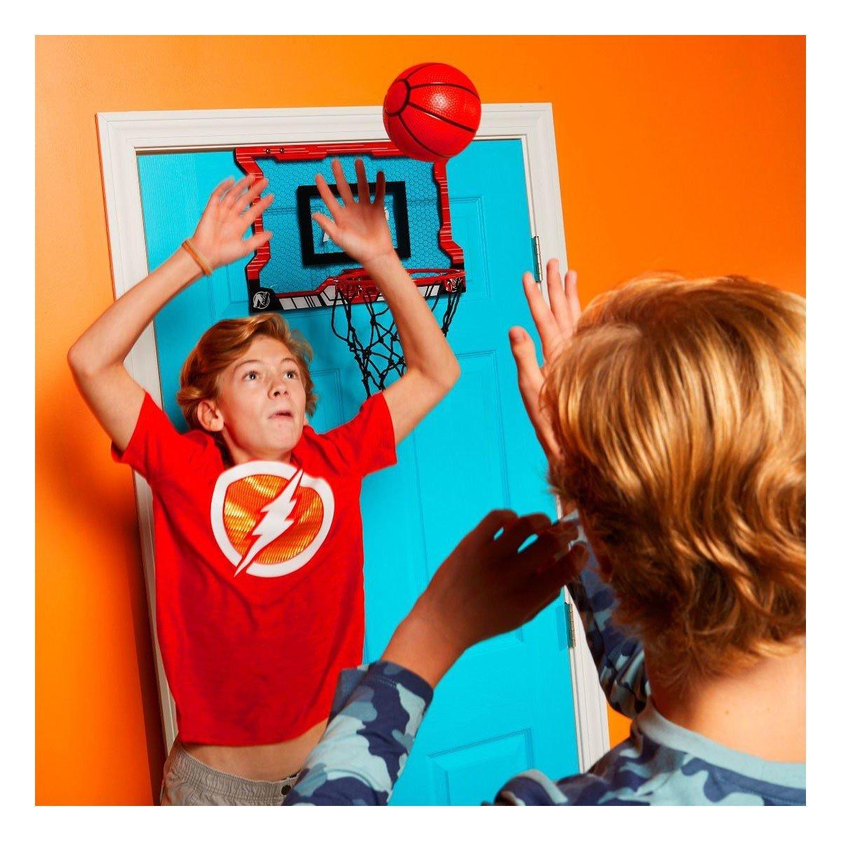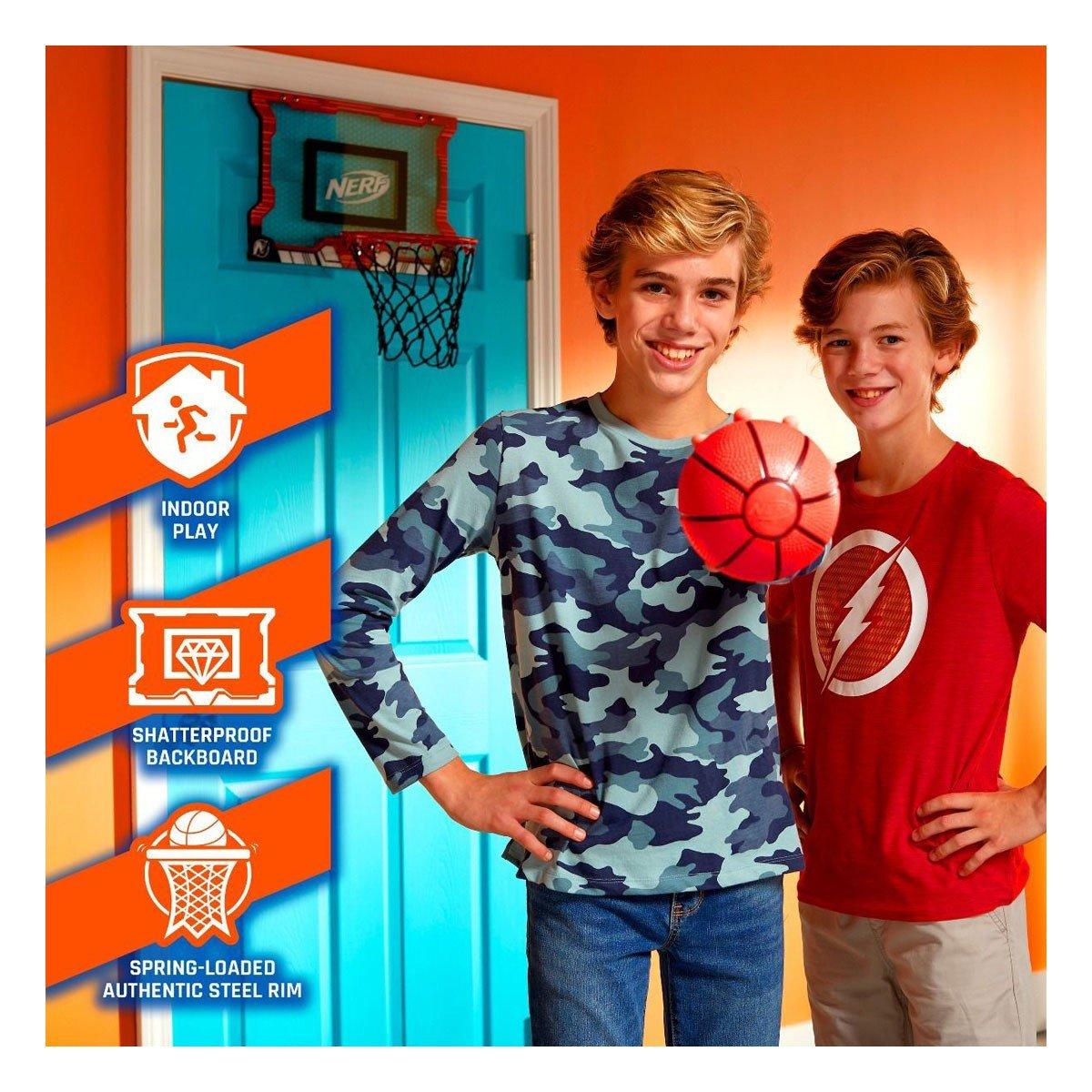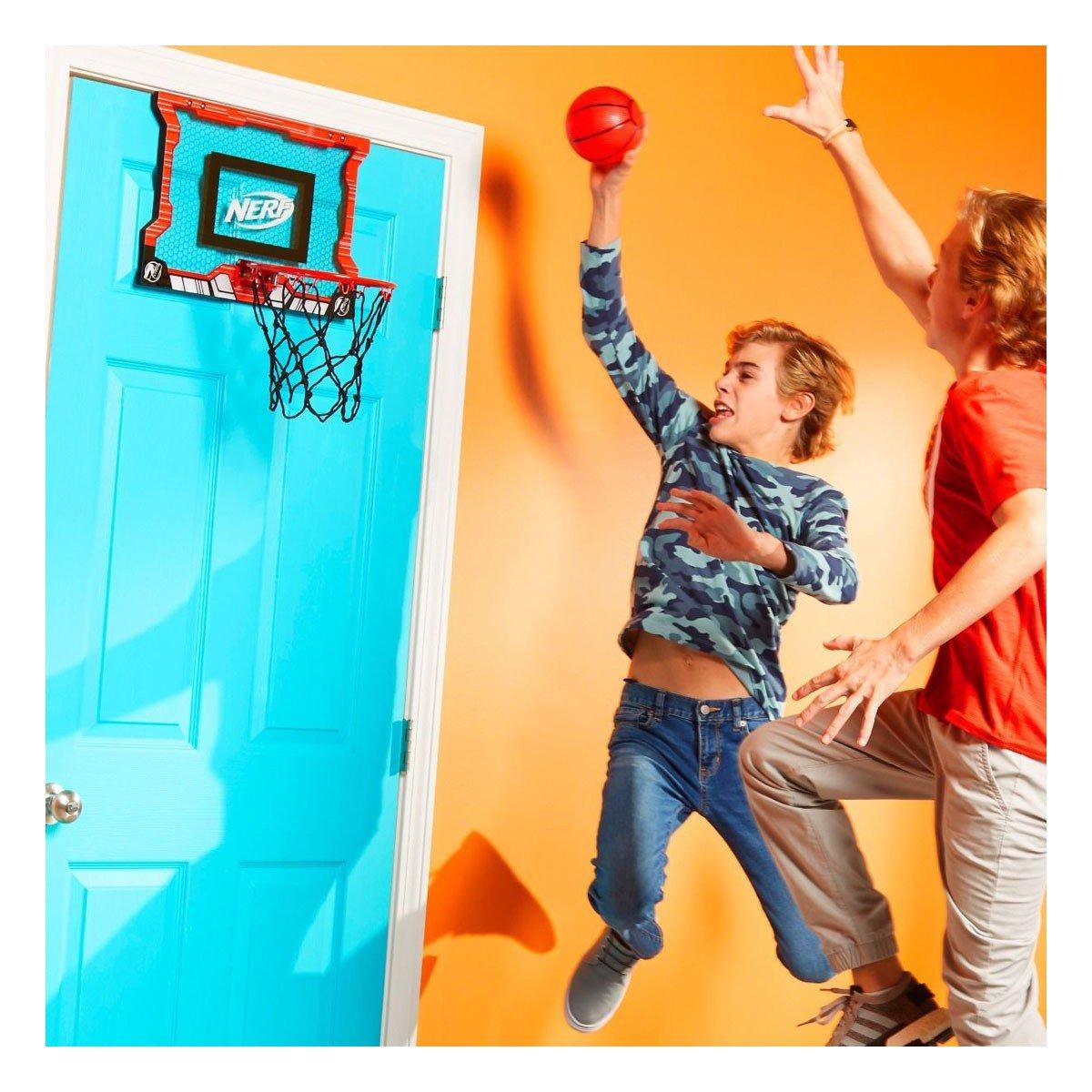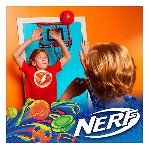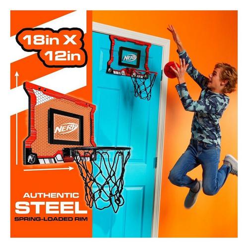 The NERF Pro Hoop Basketball Set transforms any bedroom or living room into your own personal basketball court in no time! This premium quality over-the-door hoop fits on a standard sized door and assembles in seconds so you can get right into the action. The shatter-proof polycarbonate backboard and spring-loaded steel rim gives this hoop an authentic feel with premium performance to stand up to even the most ferocious dunks! Plus, this hoop includes a NERF mini basketball, so you have what you need to get the game started right out of the box. If you're ready to bring some high-quality hoops into your home, look no further, and grab your NERF Pro Hoops Basketball Set today!