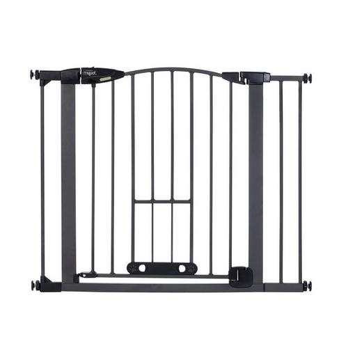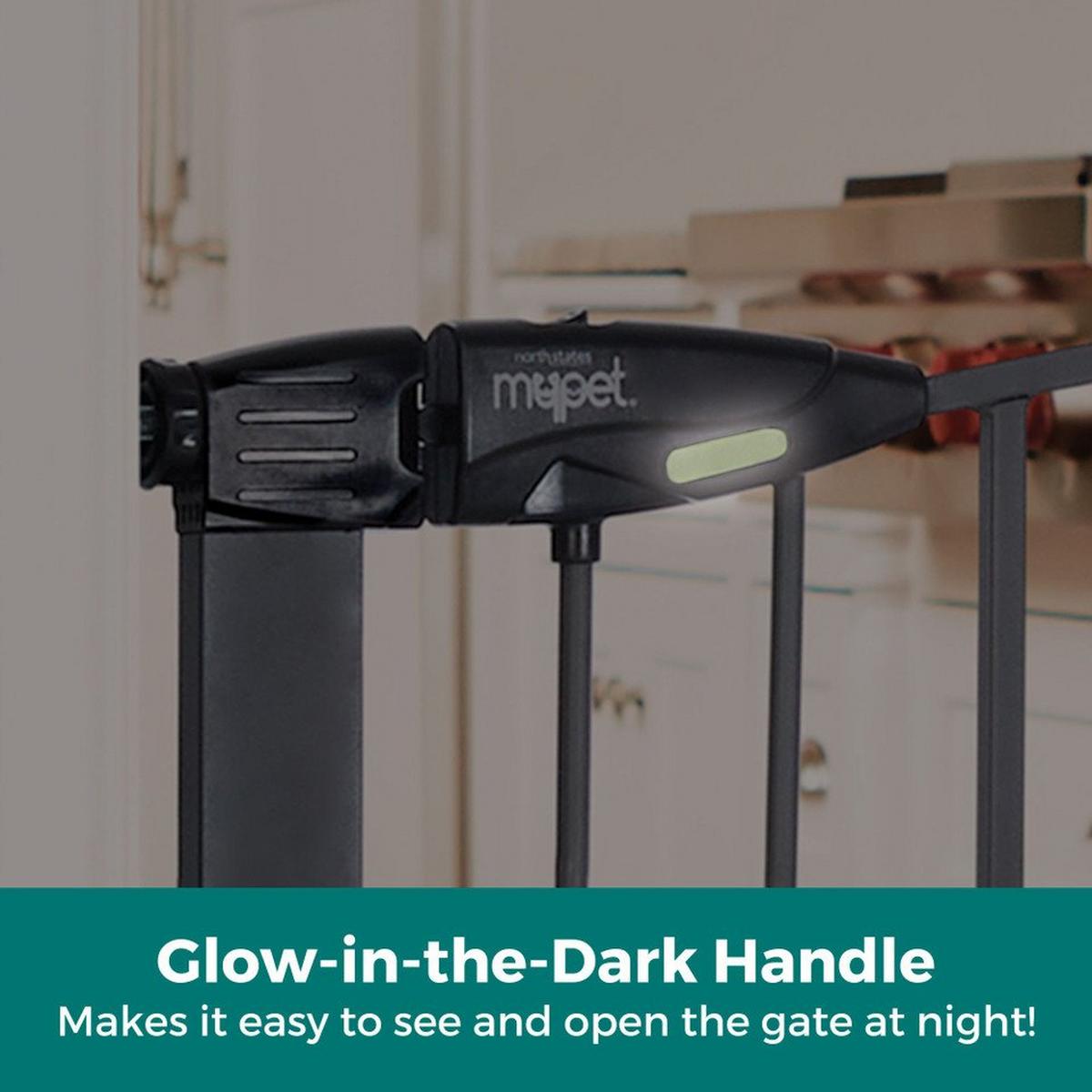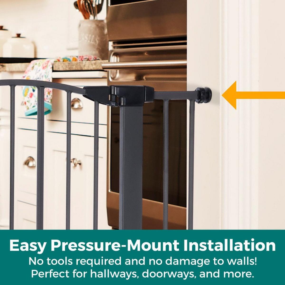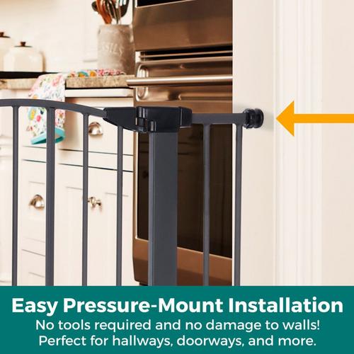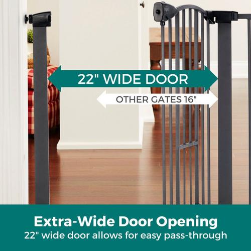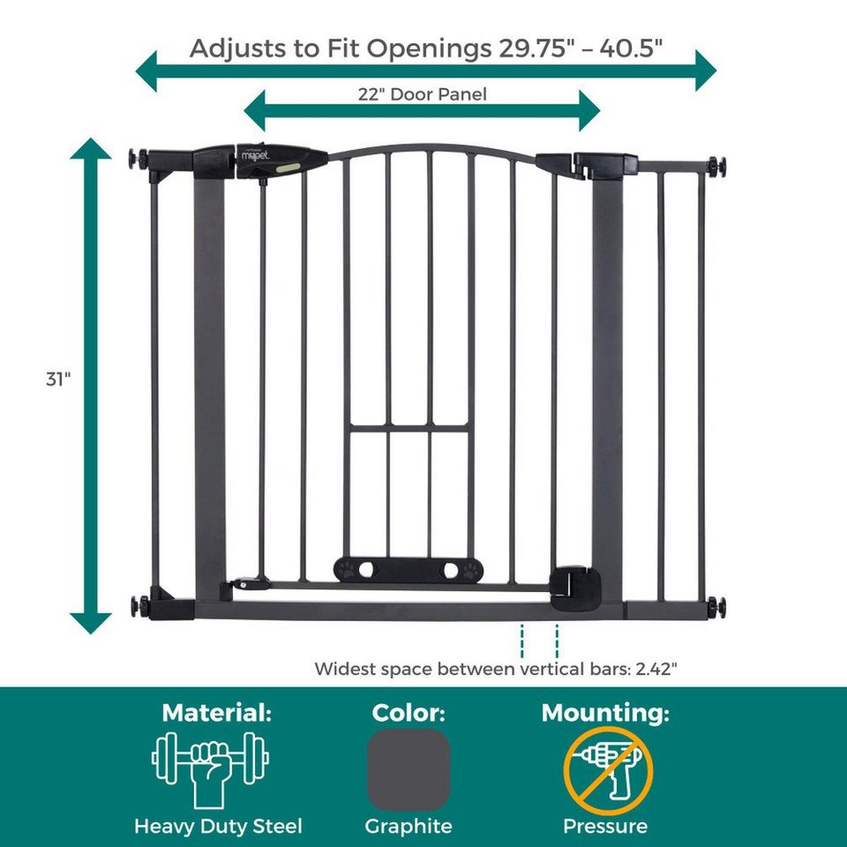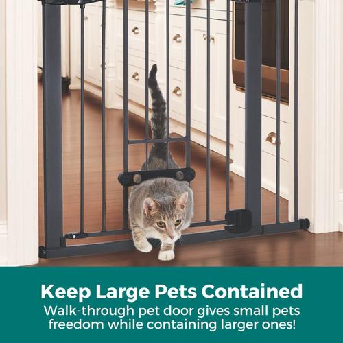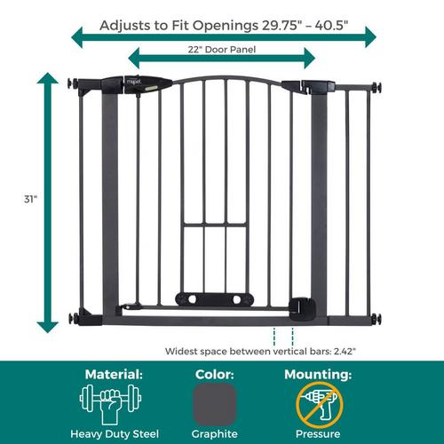 Innovation abounds with the Wide Deco Arch EasyPass Pet Gate® with Auto Close from North States. The patented EasyPass pet door makes this gate truly unique. The small dog door retracts up into the gate tubing at three height intervals (5”, 6.5” & 8”) so it can be left open at the desired height, depending on your pet’s size. The small door can also be used as a cat door for the furry feline in your life. It allows smaller dogs and cats the freedom to come and go while larger pets stay contained. When it’s time to close the small pet door, simply use the designated slots found on the door and squeeze to gently bring the door down – no annoying small door that’s been left open to trip over! This dog gate has an extra wide 22” door for the entire family to walk through with ease. To control the direction that the gate swings, a swing control lever allows you to decide - swing in one direction or allow the gate to swing in both directions. There’s also a glow-in-the-dark feature on this gate which illuminates the large easy-grip handle, making it easy for you to see and open the gate at night. The beautiful graphite grey finish and graceful arch on this sturdy steel construction gate will complement your home decor. This gate fits openings from 29.75 - 40.5 inches wide and comes with two extensions. Quickly and easily install this pressure-mounted gate with the twist of the tension mounts. Safety and containment all wrapped up in one gate – how simple.