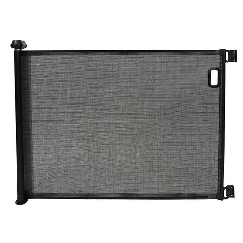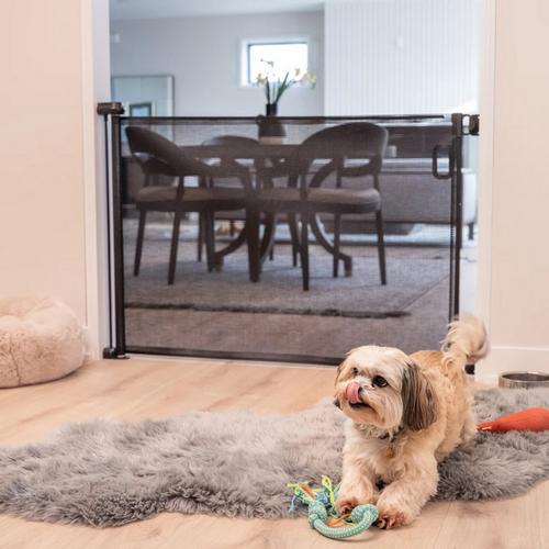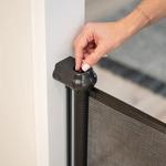 Built for long-lasting stability, the gate features sturdy 4-point hardware-mounted brackets for installation on either the inside or outside of a door frame. Sturdy mounting brackets, baseboard spacers, and steel hardware are included to ensure a precise fit on a variety of surfaces. The intuitive locking system and large handle allow for simple, one-handed operation—perfect for busy pet parents juggling leashes, treats, and daily routines. When not in use, the mesh quietly retracts and stores flush against the wall, keeping your space neat and uncluttered. Crafted from durable metal and strong mesh, the gate can also be removed from its brackets for cleaning or storage, and wipes clean easily with just a damp cloth.