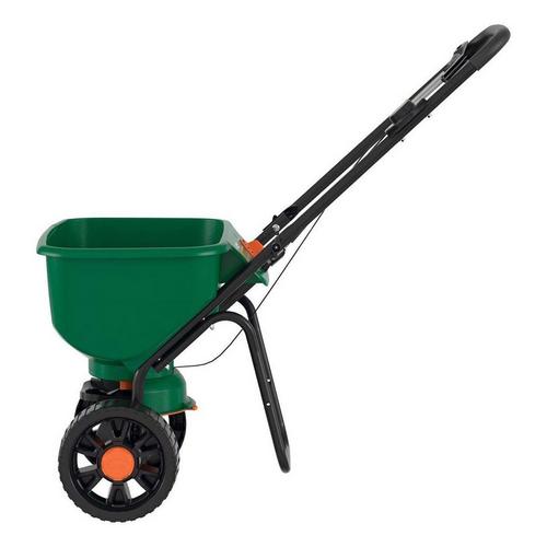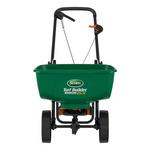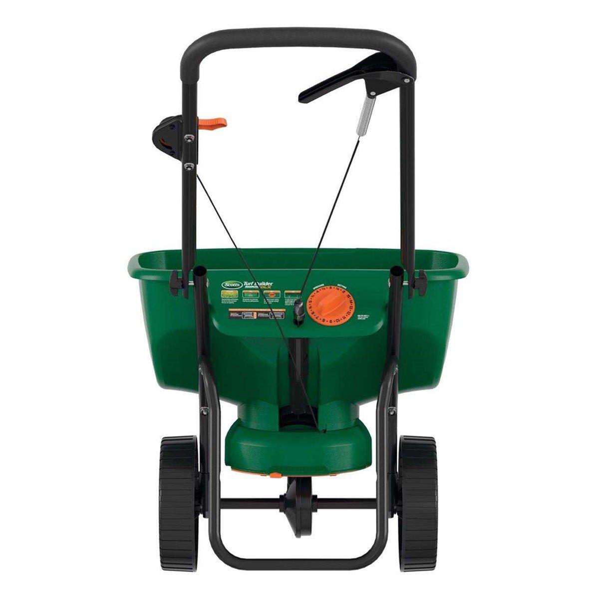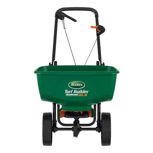 Use the Scotts® Turf Builder® EdgeGuard® DLX Broadcast Spreader to apply fertilizer, grass seed, and other lawn care products. This lawn spreader comes pre-calibrated and ready-to-use, and holds up to 15,000 sq. ft. of Scotts® product. When EdgeGuard™ is engaged, it will block off the right-side of the spreader pattern to prevent product from spreading onto non-lawn areas. Using the Scotts® Turf Builder® EdgeGuard® DLX Broadcast Spreader is simple. To begin, turn rate control dial to the correct setting listed on the back of each Scotts® product, pour the product in the hopper, then start spreading. The spreader's design enhancements feature a curved hopper and dual-bladed agitator for smooth product funneling and consistent coverage. Spreaders provide uniform coverage of granular products; without one, you may end up with uneven coverage of fertilizer or control products that can result in uneven feeding, weed, disease, or insect control. Scotts® spreaders can also be used to distribute salt on walkways and driveways.