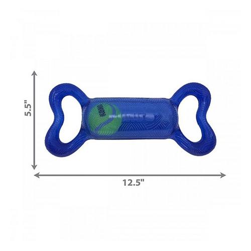 KONG Jumbler Tug Bone’s rolling interior tennis ball and loud squeak spark tug-and-fetch fun. This durable toy is built to last through tough play with two handles that make tugging and shaking easy for long-lasting rounds of interactive play.