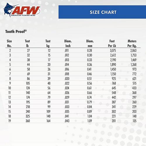 Tooth Proof leader wire lives up to its name and provides maximum protection against the ferocious jaws of Barracuda, King Mackerel, Wahoo and other toothy fish. Made from specially controlled Type 304 stainless steel alloy to be hard, but not brittle, and to deliver the perfect combination of flexibility and strength. Tooth Proof possesses incomparable abrasion resistance and tames the toughest toothy fish. AW's unique pre-straightening process eliminates cast, providing a straighter leader wire with improved kink resistance. Special Camouflaged Brown finish vanishes in deep water. Tournament tested tough, this proven leader wire continues to put anglers on the winner board! Made in USA by AFW.