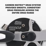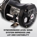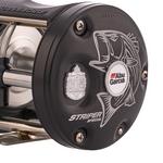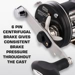 Born from the round reel platform, the Ambassadeur® Striper Special fishing reel offers anglers a unique package backed with proven components designed with striper fishing in mind. Performance starts with 3 stainless steel ball bearings + 1 roller bearing system and a smooth and consistent Carbon Matrix™ drag system. The 6-pin centrifugal brake delivers controlled casting while the extended bent handle with power knob gives anglers additional torque and power for hard-pulling fish. The synchronized level wind system ensures even line lay and a smooth retrieve.