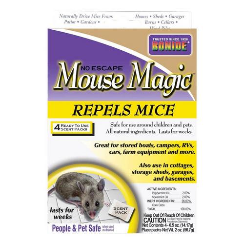 BONIDE Mouse Magic Scent Packs repel mice in the home, garage, cottage, attic or where ever mice could be a problem. Made with natural ingredients. People & pet safe, when used as directed.