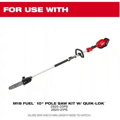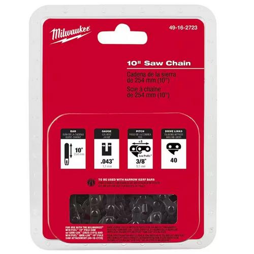 Finish projects faster with the Milwaukee 10 in. Saw Chain. This replacement saw chain delivers fast cuts with low vibration and minimum kickback. It drives lengths of 40 in. and has a 3/8 in. low profile pitch. The durable chain is weather resistant for increased life. It's designed for use with the M18 FUEL 10 in. Pole Saw with QUIK-LOK and M18 FUEL QUIK-LOK 10 in. Pole Saw Attachment.