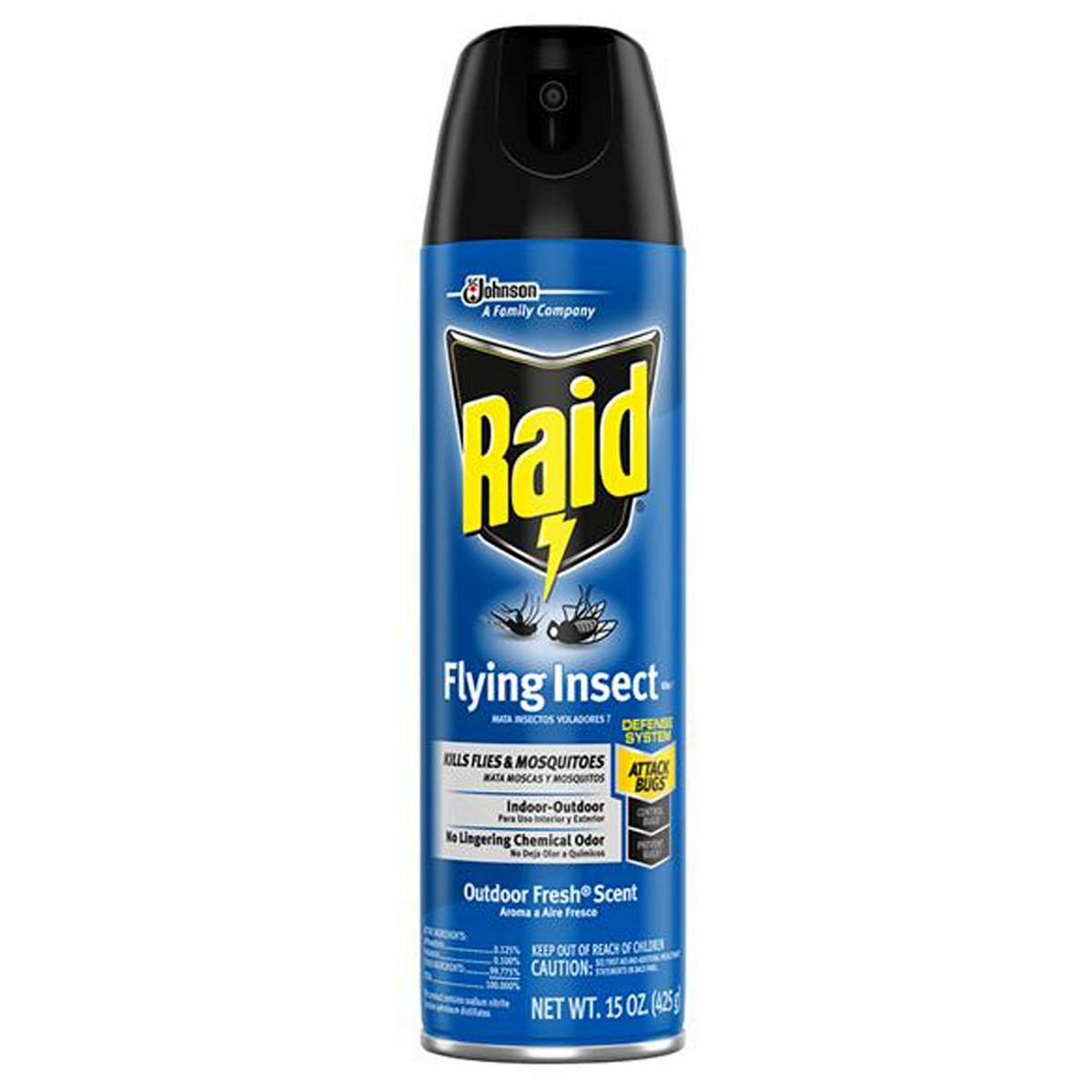 Raid® Flying Insect Killer is specially formulated to kill a number of flying insects including flies, mosquitoes, wasps, and hornets. It can be used both indoors and outdoors and has a pleasant Outdoor Fresh® scent.