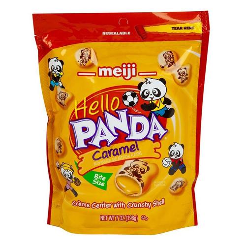 Meiji® Hello Panda Caramel cookies are filled with a buttery caramel creme, for the perfect bite-sized snack. You will love the personality-packed pandas printed on each tiny cookie, and the fun packaging. Meiji cookies are a sought-after Japanese snack. The larger standup resealable bag is perfect for sharing the unique treat.