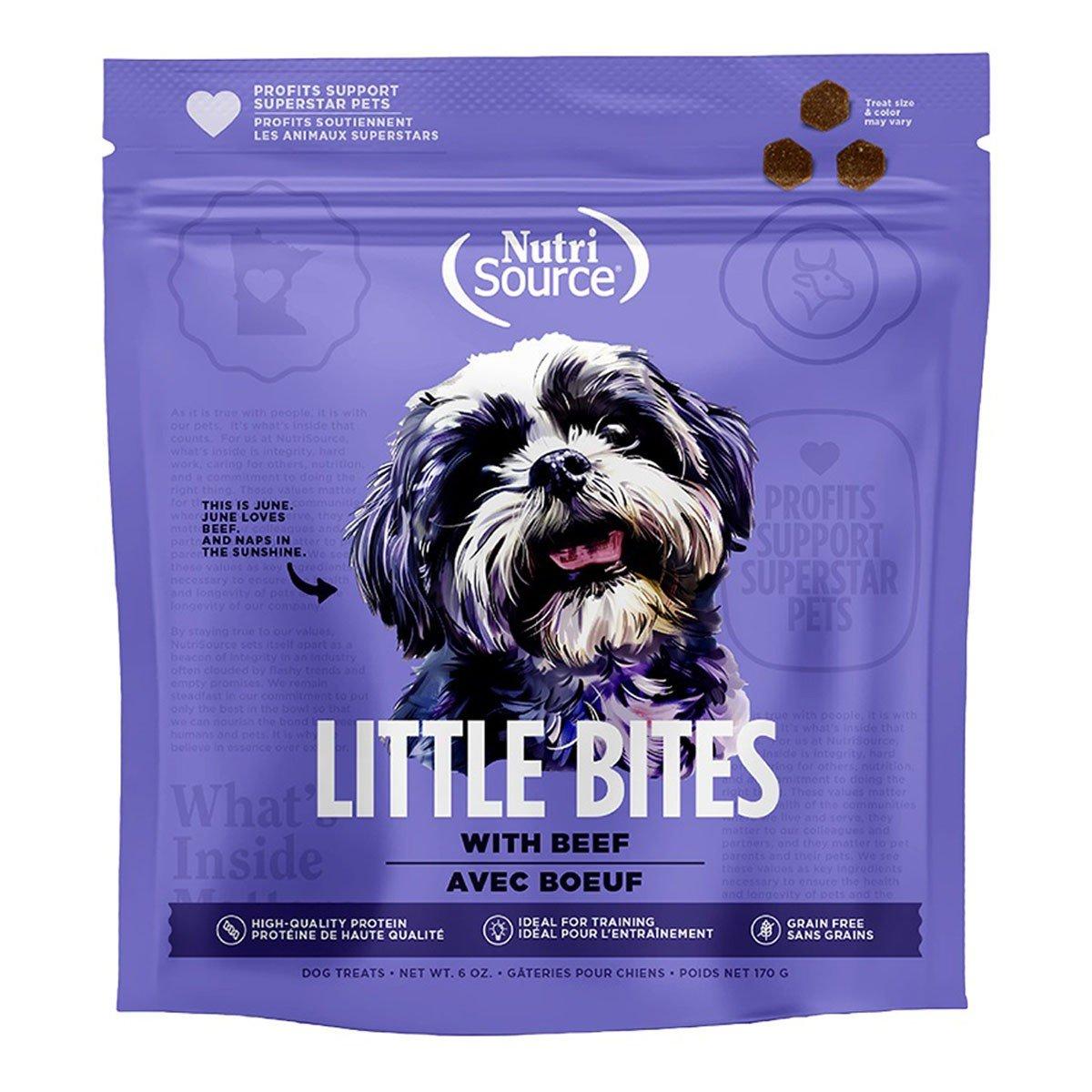 {"reviews":[{"id":6853215,"locale":"en_US","rating":5,"title":"Great snack for small dogs","text":"Fed these to my Shih-Tzu and he loved them. Perfect size snack for smaller dogs.","textLength":80,"csFlag":false,"inappropriateFlag":false,"reviewedFlag":true,"autoModerated":true,"published":true,"incentivized":false,"upVotes":0,"downVotes":0,"orderId":"147810680","dimensions":[],"responses":[],"tags":[],"media":{"photo":[],"video":[],"audio":[]},"user":{"nickName":null,"firstName":null,"lastName":null,"emailAddress":null,"externalId":null,"city":null,"state":null,"country":null,"ageRange":null,"badge":null,"shopperProfiles":[]},"reviewedDate":"2025-07-10T14:06:54-04:00","purchaseDate":"2025-06-28T00:00:00-04:00","dateCreated":"2025-07-10T13:04:26-04:00","customData":[],"acceptedTermsAndConditions":true,"incentiveType":null,"campaign":null,"deviceFingerprint":null,"topics":[],"catalogItems":[{"sku":"4189-80017","title":"NutriSource Grain Free Little Bites Dog Treats","url":"https://www.scheels.com/p/4189-80017","category":"dog-treats","reviewCount":1,"ratingCount":1,"averageRating":5,"ratingBreakdown":{"1":0,"2":0,"3":0,"4":0,"5":1},"active":true,"attributes":[]}]}],"offset":0,"limit":10,"total":1,"gtin":"073893800163"}"Full Description:\n<strong>Details:</strong>\n<ul>\n\t<li>NutriSource Beef Grain Free Little Bites are made with high-quality protein.</li>\n\t<li>Real foods that dogs love in a treat make these totally satisfying!</li>\n\t<li>June loves beef. And naps in the sunshine.</li>\n\t<li>Profits support Superstar pets.</li>\n</ul>\n<strong>With Beef:</strong><br />\nIngredients: Beef, peas, potato flour, chickpeas, cane molasses, vegetable glycerin, flax seed, pork plasma, salmon oil (preserved with tocopherols), sweet potatoes, calcium lactate, natural flavor, lactic acid, salt, zinc propionate, calcium propionate (a preservative), preserved with citric acid and tocopherols, yucca schidigera extract, L-carnitine, rosemary extract.<br />\n<br />\n<strong>With Trout: </strong><br />\nIngredients: Trout, peas, potato flour, chickpeas, cane molasses, vegetable glycerin, flax seed, pork plasma, salmon oil (preserved with tocopherols), sweet potatoes, calcium lactate, natural flavor, lactic acid, salt, zinc propionate, calcium propionate (a preservative), preserved with citric acid and tocopherols, yucca schidigera extract, L-carnitine, rosemary extract.\n\nSpecifications:\n\u003cul>\n\u003cli>6 oz bag\u003c/li>\n\u003c/ul>\n"