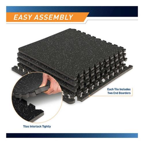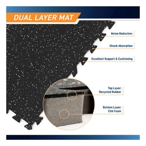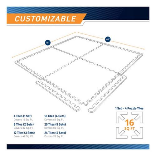 In addition, the mats help dampen sounds during your workout. Composed of Four 2-by-2-foot foam puzzle tiles, the Marcy Dual Density Fitness Gym Mat can be easily assembled in to a 16 square foot non-skid surface for home gyms. Need to cover more space? Easily add more Dual Density Fitness Gym Mats to the first set to cover the floor of your entire garage gym.