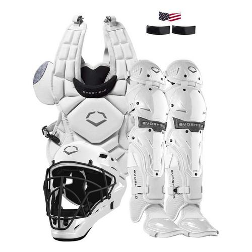 Playing backstop is serious business. That's why the EvoShield Fastpitch Catcher's Gear Kit equips you with head-to-toe protection to stay safe all season. Made for fastpitch players of every skill level, this kit includes our Pro-SRZ Solid Catcher's Helmet, Pro-SRZ Catcher's Upper and Lower Leg Guards and Chest Protector. Made for confidence in front of the ball, it is the first-ever fastpitch chest protector that's engineered to meet the Commotio Cordis test standard required for heart protection in baseball. Our catcher's helmet features a padding system with moisture-wicking fabric to optimize comfort and a steel facemask designed to keep your eye on the ball. The chest protector comes with two extra pieces of black hook-and-loop fabric that you can embroider for a customized look and a third piece of hook-and-loop fabric that features a USA flag. The two-piece leg guard system can be adjusted up or down by two inches, and the lower leg guards are made of our Gel-to-Shell® Technology that molds to you like a glove and disperses impact energy.