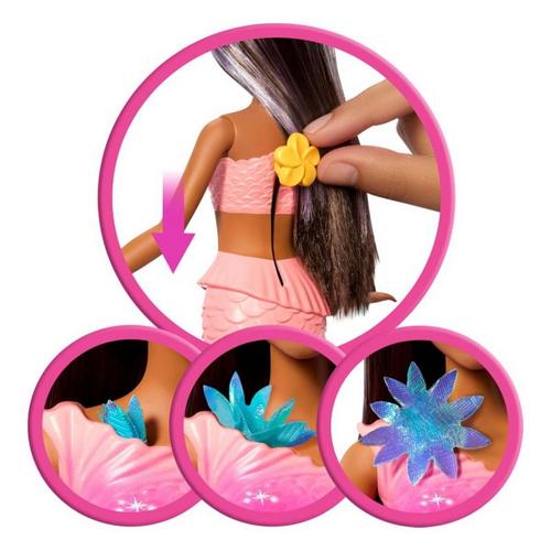 Blossom into fun with Barbie Flower Magic Mermaid doll! Slide the lever on her back to see flowers magically 'bloom' from her bodice to her fins, over and over again! Kids can play with these dolls on land and in water for a beautiful blossoming display under the sun or sea. With her iridescent flowers, ombre fins, and pearl headband accessory in her gorgeous long blonde hair with pink highlights this Barbie mermaid doll is as enchanting as an undersea garden. Doll cannot stand or swim alone.