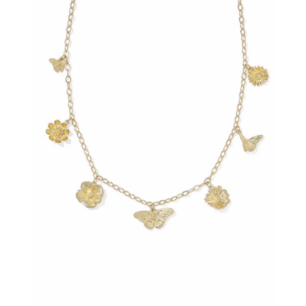 Stunning flora and fauna come together to create the Cailey Gold Charm Necklace. Featuring fluttery metallic charms of butterflies and Texas wildflowers complete with sparkling accents, this necklace is perfect for those who love nature.