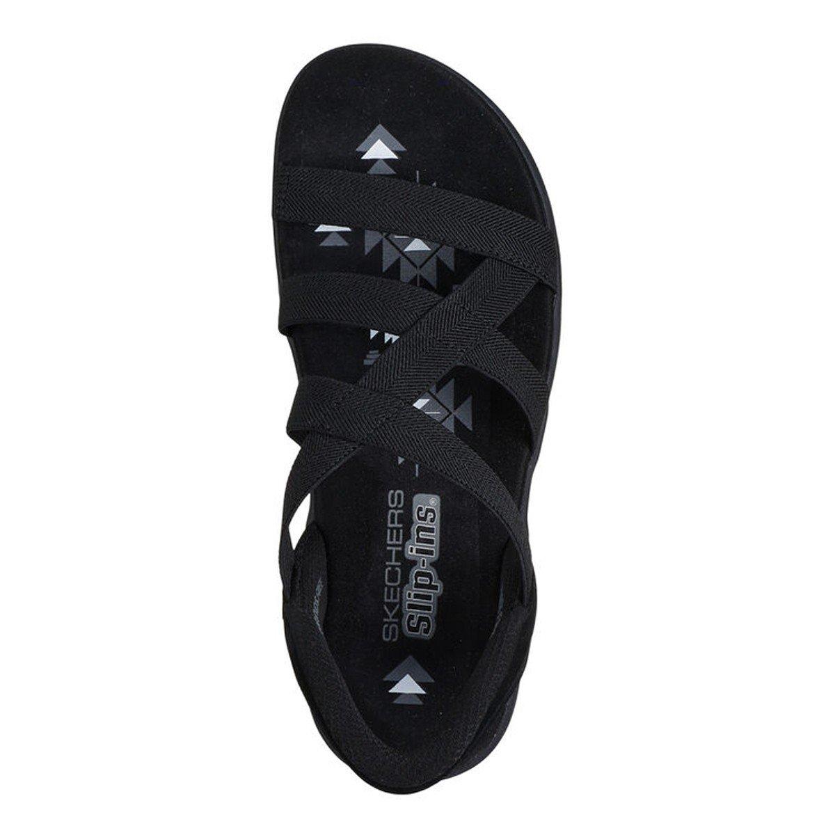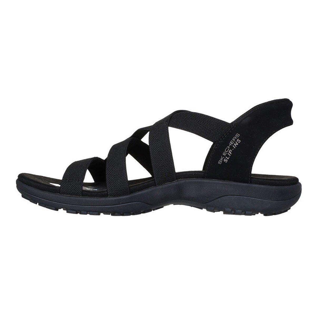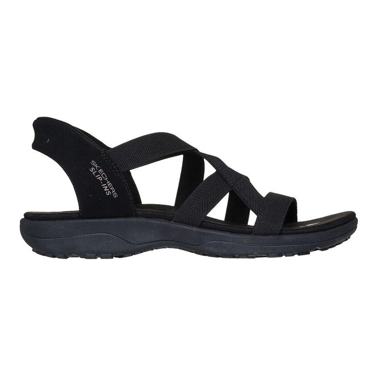 Enjoy sunny days in breezy comfort with Skechers Hands Free Slip-ins®: Reggae Slim - Stretch Flex. Designed with our Heel Pillow™, this strappy sandal features a stretch fabric strap upper with a back heel piece and cushioned footbed.