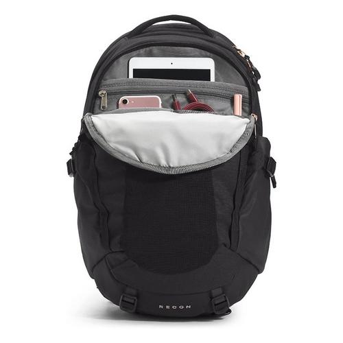 The North Face Women's Recon Luxe Backpack reimagines a classic daypack with elevated style and functionality, perfect for daily commutes or adventures. This backpack features a women-specific FlexVent™ suspension system, certified by the American Chiropractic Association, ensuring exceptional comfort and support throughout your day. It includes a protective laptop compartment and a spacious main compartment, alongside a front compartment with internal organization to keep your essentials tidy. Premium metallic accents, including an embroidered logo and zipper pulls, add a touch of luxury to its durable recycled nylon ripstop construction. Complete with convenient water bottle pockets, compression straps, and 360-degree reflectivity, The North Face Women's Recon Luxe Backpack is a practical design for any active lifestyle.