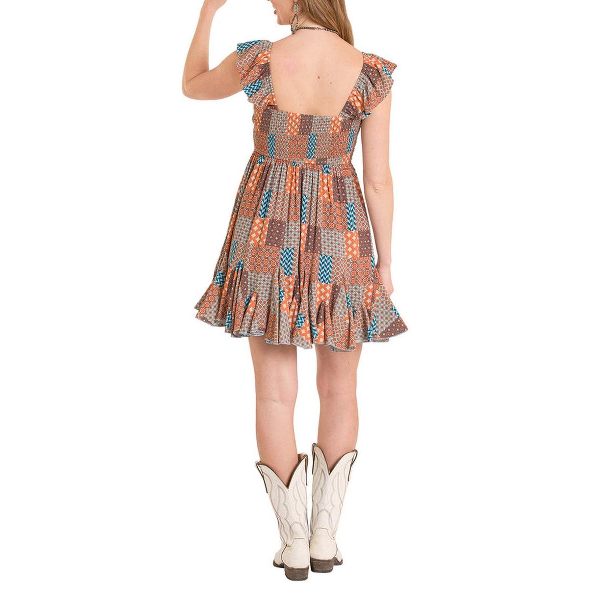 A style of its own, the Patch Print Godet Mini Dress is perfect for any occasion. Crafted from 100% rayon, this dress features a smocked bodice, ruffled sleeves, and a flounce skirt with godet inserts for an added layer of fun. This dress adds a touch of style to any outfit.