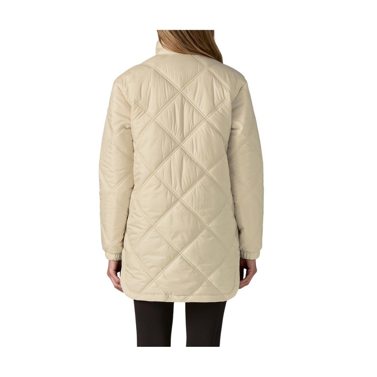 The Patagonia Women's Pine Bank Insulated Parka is a warm, sporty, and stylish jacket built for transitional seasons and milder winter climates. Crafted from 100% recycled polyester ripstop with a durable water repellent (DWR) finish made without intentionally added PFAS, this parka provides reliable protection from the elements. Insulated with 100-g Thermogreen® 100% recycled polyester, it delivers lightweight warmth without the bulk. Diamond quilting and a curved hem create a modern silhouette that's perfect for layering, while multiple pockets and a zippered front closure ensure functionality and comfort. Made in a Fair Trade Certified™ factory, this jacket is a testament to both performance and sustainable practices.
