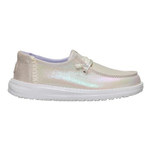 Add some dazzle to the day in these twinkling Wendy shoes for big kids. They sparkle with a shimmery textile upper that's accented with some fun ruffly detail. The easy-on design includes a wide collar that kids can step right into and elastic laces that don't need to be tied. They're light, bendy and comfy for all-day adventures