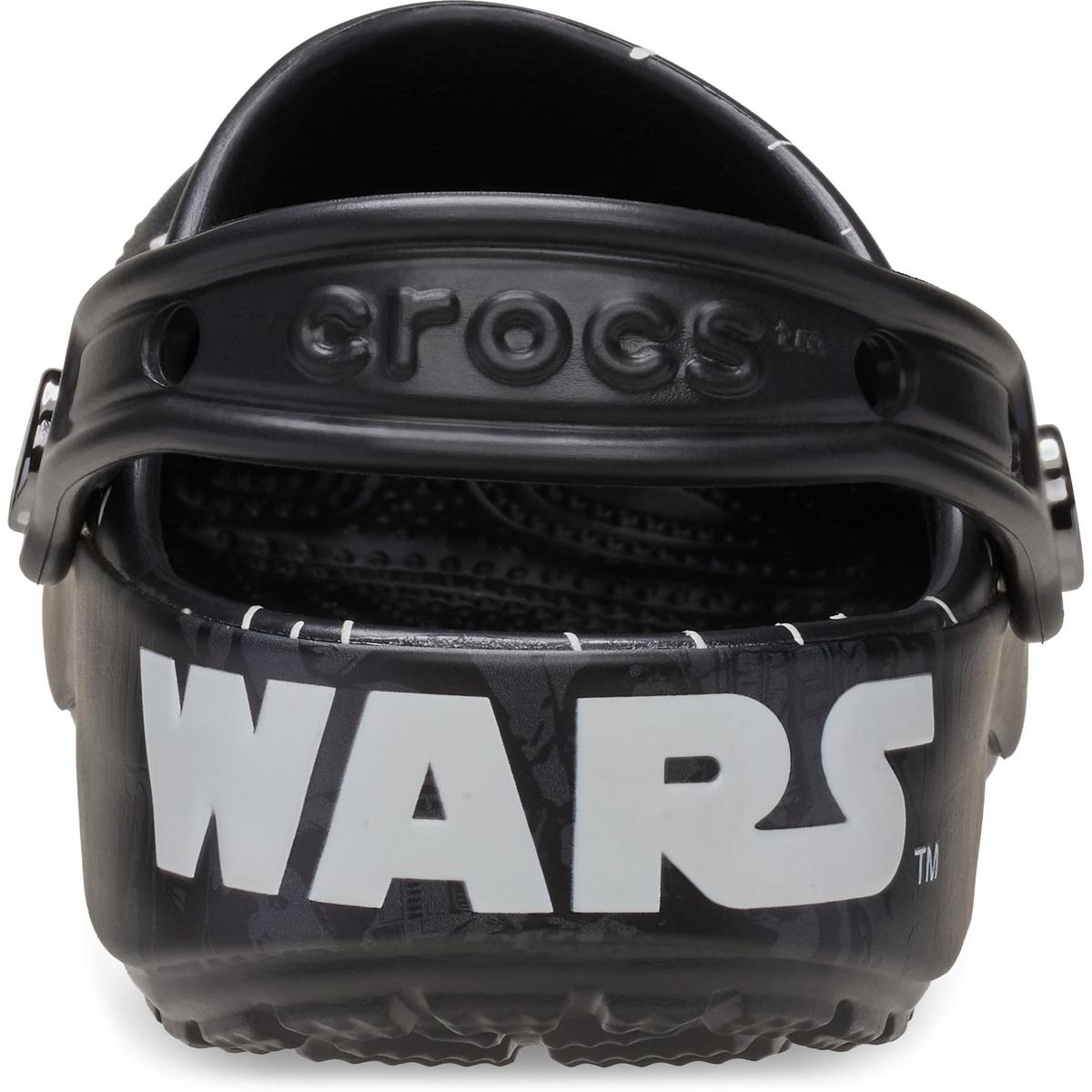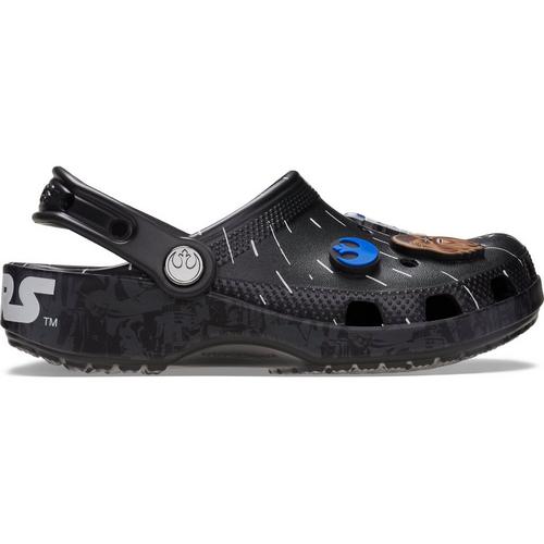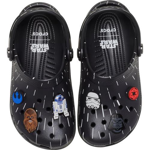 Throw it into full throttle with the Hyperspace Classic Clog from the STAR WARS™ collection. This comfortable clog captures the rush of hyperspace with streaking star graphics across the upper and an embossed STAR WARS™ logo across the heel cup. Dark side or light side, each clog features 3 exclusive Jibbitz™ charms like R2-D2 and Chewbacca, as well as Darth Vader and a Stormtrooper, so each step takes you down a different path.