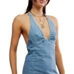 Features: Plunging halter neckline, defined cups at bust, soft denim fabrication, zip closure at back, open back style