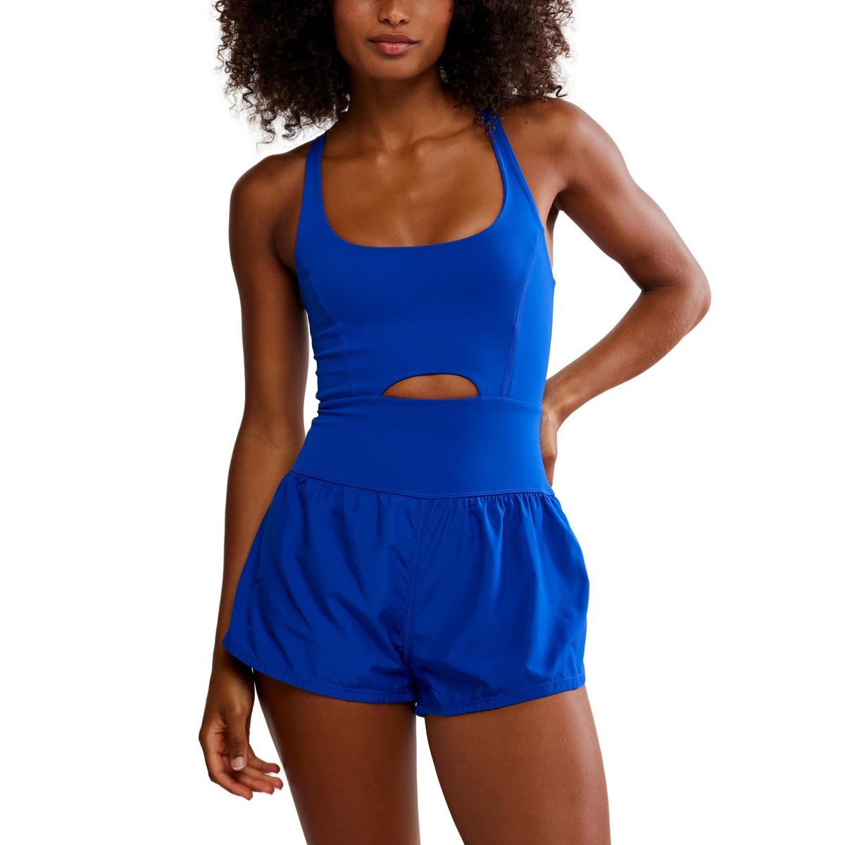 Simplify your workout wardrobe with the FP Movement Righteous Runsie, the perfect one-and-done outfit for your active routine. This easy romper features a slim-fitting top with a cooling cutout at the center, paired with airy retro-style shorts for comfortable movement. Designed with a compressive, sleek fabric, it offers supportive comfort through light-to-medium intensity workouts. The breathable material ensures airflow to keep you cool, while a strappy cutout back and a back zipper pocket add both style and practicality.