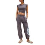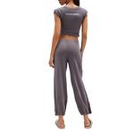 Features: Soft, jersey fabrication; relaxed fit; cropped muscle tee top with seaming detail; ankle length pant with high-rise waist and wide leg; elasticated waistband and cuffs; crossover detail on top; ribbed collar; side seam pockets