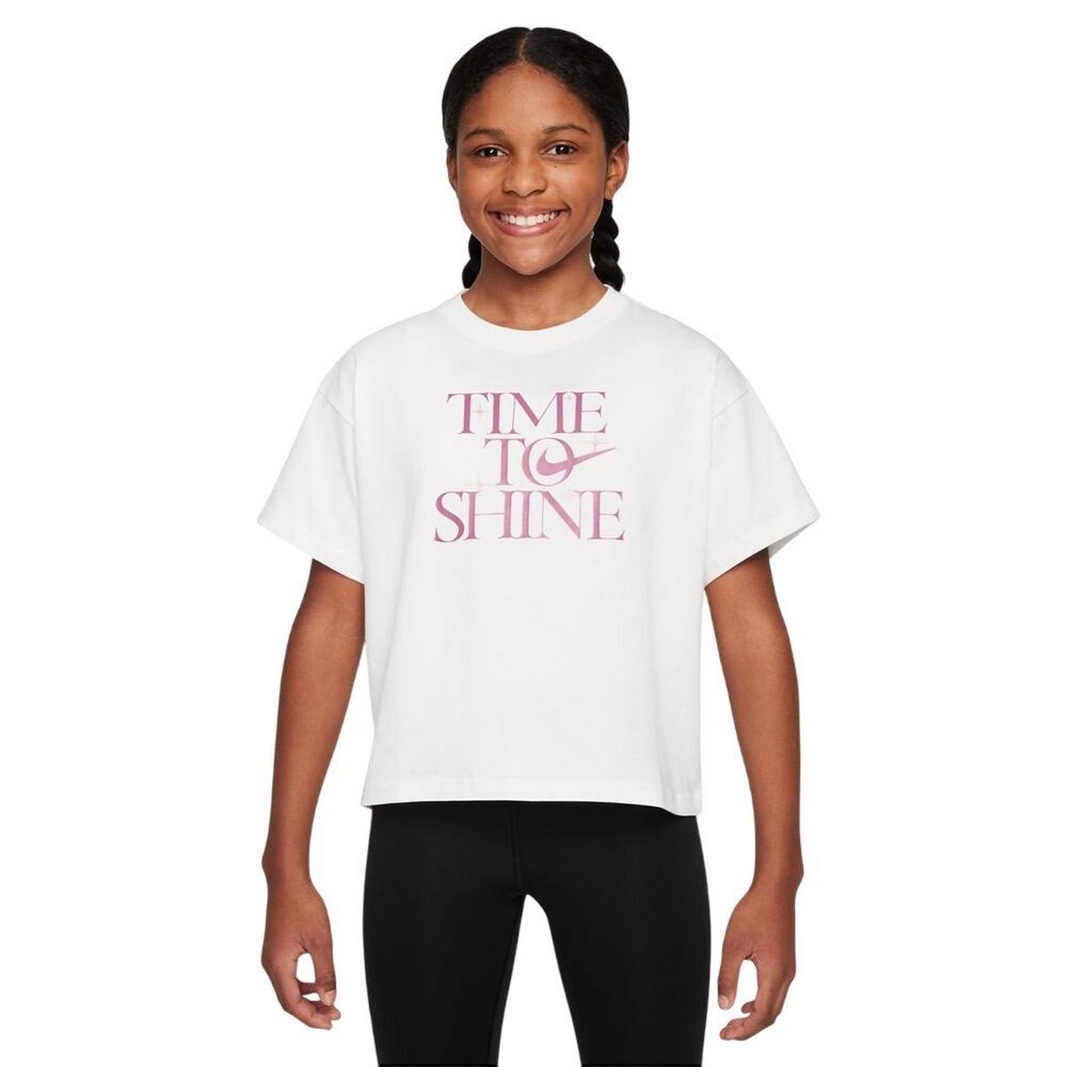 The Girls' Nike Sportswear "Time To Shine" T-Shirt offers classic comfort and timeless style. Crafted from lightweight, breathable fabric, the Girls' Nike Sportswear "Time To Shine" T-Shirt is designed to keep you cool and comfortable, no matter the activity. Whether you're running errands or hitting the gym, this Girls' Nike Sportswear "Time To Shine" T-Shirt will keep you looking and feeling your best.