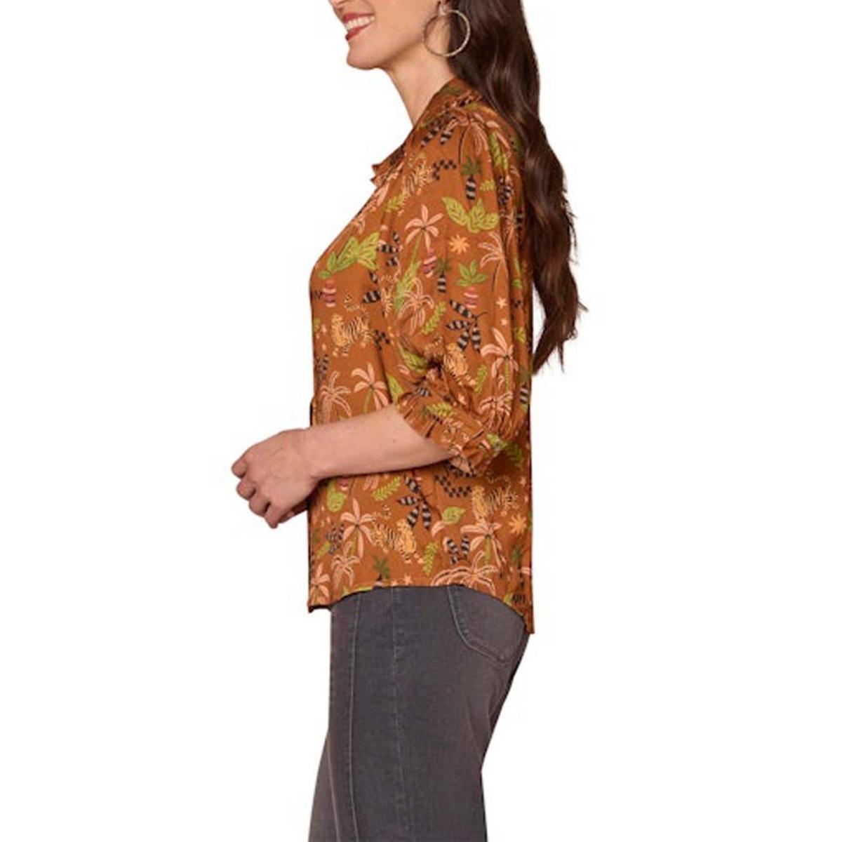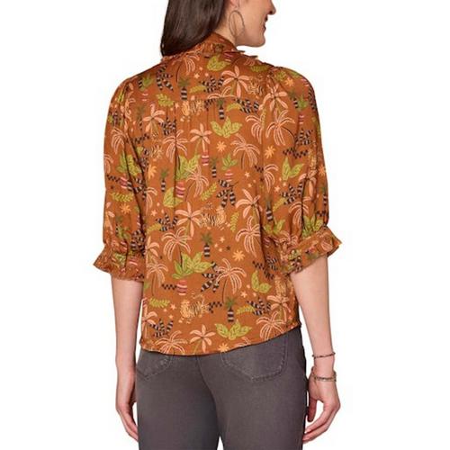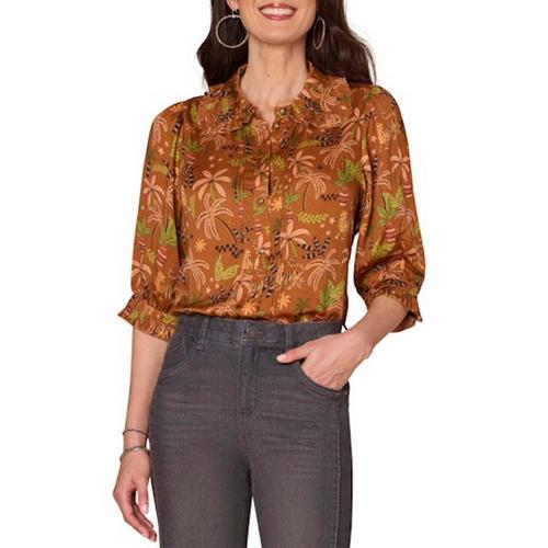 Women's Democracy Ruffle Collar Printed Woven 3/4 Sleeve Button Up Shirt