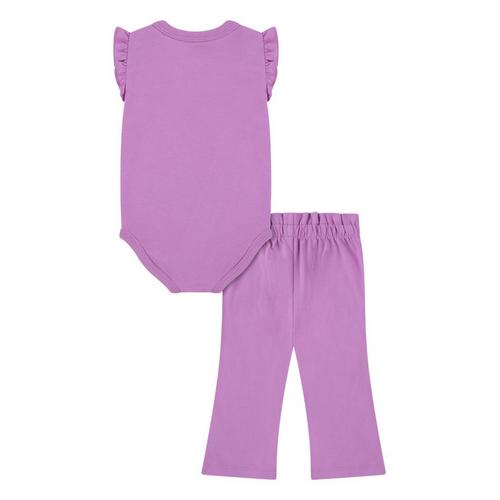 This 2-piece cotton/poly jersey knit set from Nike is an effortless way to dress your baby girl for the everyday. The bodysuit features adorable ruffle cap sleeves, with lapped shoulders and snappy tape closures on the crotch for easy changing and dressing. The pants feature a modern, stretch paperbag waist for a comfy fit and flared legs add to the stylish look.