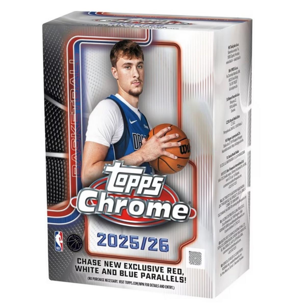 The 2025-26 Topps Chrome Basketball set, marks the return of Chrome as the premier premium NBA trading card product with a fully licensed collection. Featuring a 299-card base set of top rookies, current stars, and legendary icons, the release includes vibrant Chrome parallels, bold new inserts, and sought-after autograph and relic cards.