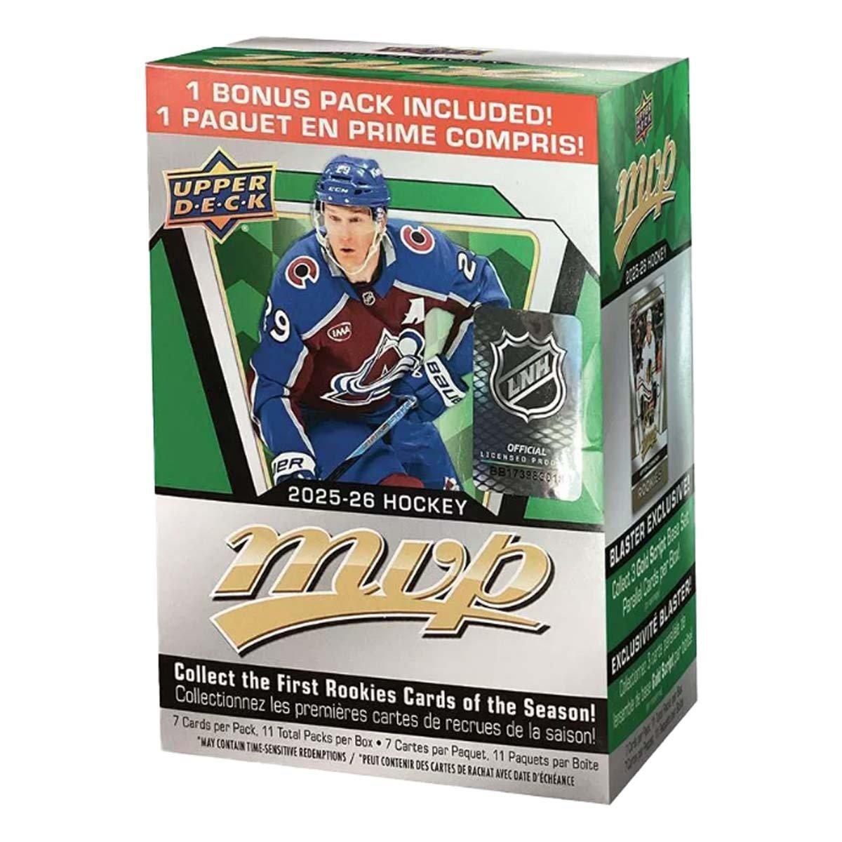 {"reviews":[],"offset":0,"limit":10,"total":0}"Full Description:\n<p><strong>NEW! </strong>Collect four exciting new insert sets:</p>\n\n<ul>\n\t<li>Mascot Battle: This insert set features rival mascots who are sure to steal the show! These fun cards are sure to be a great addition to any collection. </li>\n\t<li>Net Presence: Search for this insert set featuring players who are known to have great awareness around the net! Look for some top offensive stars here.</li>\n\t<li>Rising to the Occasion: This all-new set features players who are known to rise to the occasion. Search for playoff performers and clutch moments throughout!</li>\n\t<li>Coming to Your Rink: Dynamic duos abound! Be on the lookout for this all-new insert set that features some of the top player pairings around!</li>\n</ul>\n\n<p><br />\n<strong>NEW!</strong> All new to this edition of MVP Hockey are sticker cards! Collectors should search for two different sticker cards in this set, Mascot Stickers and "Hello My Name Is" Stickers. The Mascot Stickers feature the top Mascots around! "Hello My Name Is" stickers feature top rookies and young players who are sure to make an impressive introduction! </p>\n\n<p>Look for divisionally-themed Rookie Redemption cards for 2025-26 rookies and the super rare 2025 NHL® #1 Draft Pick SP Redemption cards.</p>\n\n<p><br />\n<strong>BASE SET CARDS</strong></p>\n\n<ul>\n\t<li>Base Set (1-200) - N/A</li>\n\t<li>Base Set - Silver Script Parallel - 1:10</li>\n\t<li><strong>Blaster Bonus Pack Exclusive!</strong> Base Set - Gold Script Parallel - 1:4</li>\n\t<li>Base Set SP’s & Rookies (201-250) - 1:4</li>\n\t<li>Base Set SP’s & Rookies - Silver Script Parallel - 1:40</li>\n\t<li><strong>Blaster Bonus Pack Exclusive!</strong> Base Set SP’s & Rookies - Gold Script Parallel - 1:20</li>\n</ul>\n\nFeatures:\n\u003cul>\n\u003cli>Collect the First Rookies Cards of the Season!\u003c/li>\n\u003cli>Blaster Exclusive! Collect 3 Gold Script Base Set Parallel Cards per Box!, on average.\u003c/li>\n\u003cli>10 Regular packs + 1 Bonus pack per box\u003c/li>\n\u003cli>7 cards per pack\u003c/li>\n\u003c/ul>\n\n"