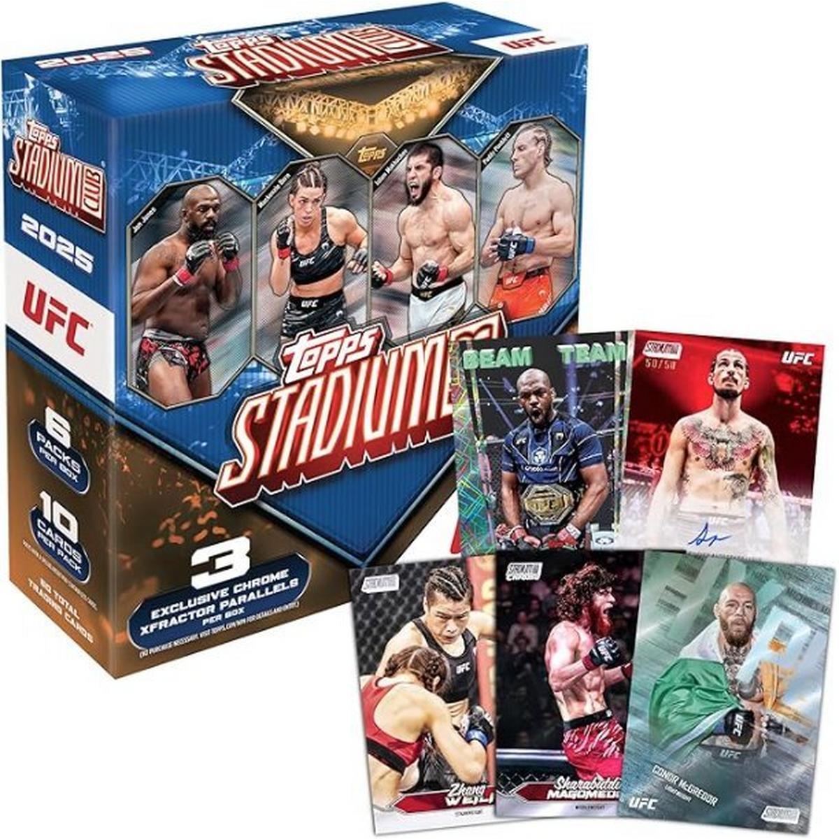 {"reviews":[],"offset":0,"limit":10,"total":0}"Full Description:\n2025 Topps Stadium Club UFC Trading Card Mega Box\n<ul>\n\t<li>3 Exclusive Chrome XFractor Parallels per box</li>\n\t<li>6 Packs per box</li>\n\t<li>10 Cards per box</li>\n\t<li>60 Total trading cards</li>\n</ul>\n\n"
