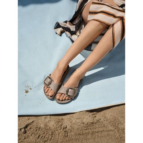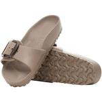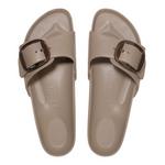 This is a new and modern interpretation of the BIRKENSTOCK classic Madrid. This version features our popular Big Buckle made from a stainless synthetic material and makes an impression with its durability and minimalist design. Modeled on the cork sandal, it is made from the ultra-lightweight and highly flexible synthetic material EVA. The high-quality, odor-neutral EVA has been tested for harmful substances and combines numerous positive attributes: it is very light, highly elastic, shock-absorbent, water-resistant, and skin-friendly.