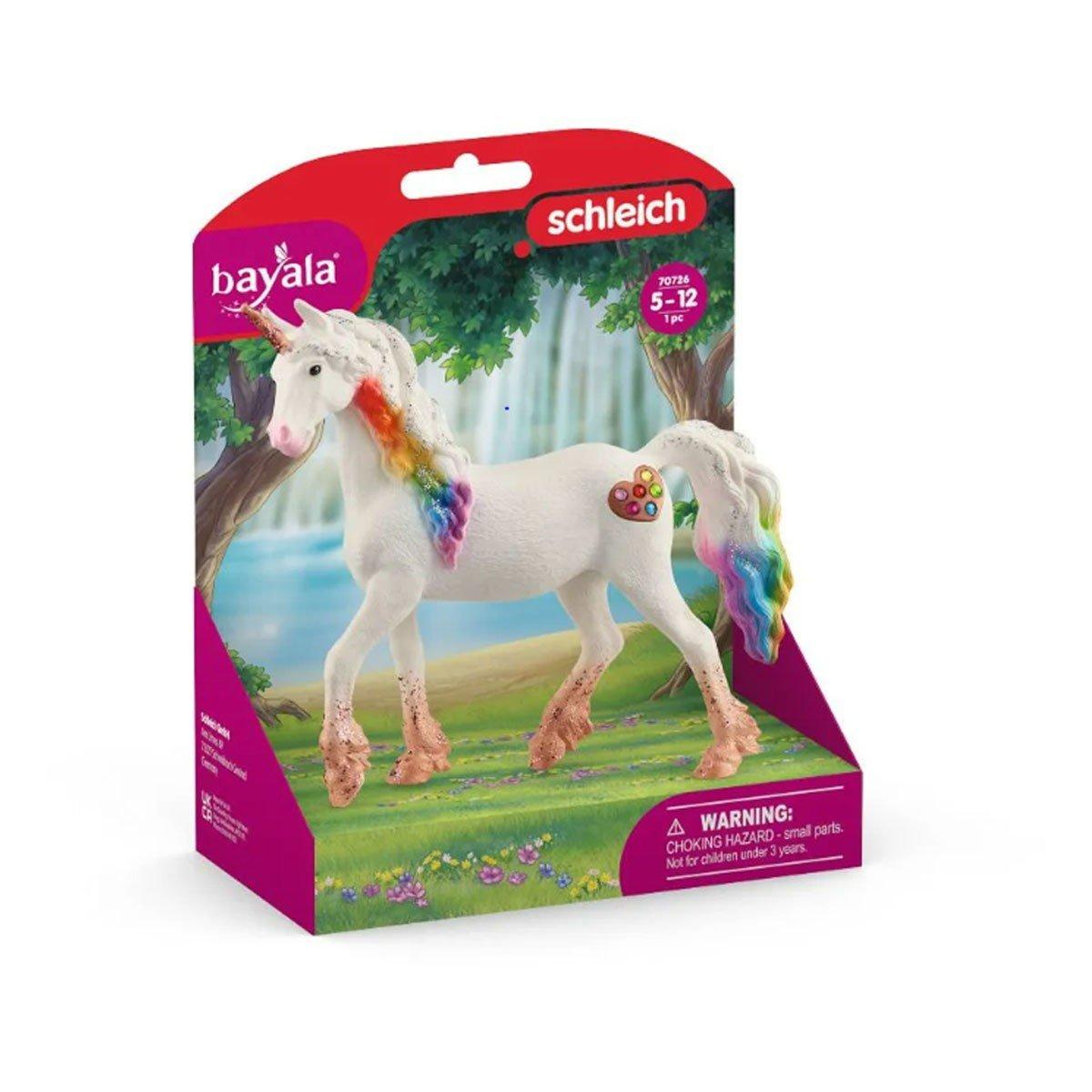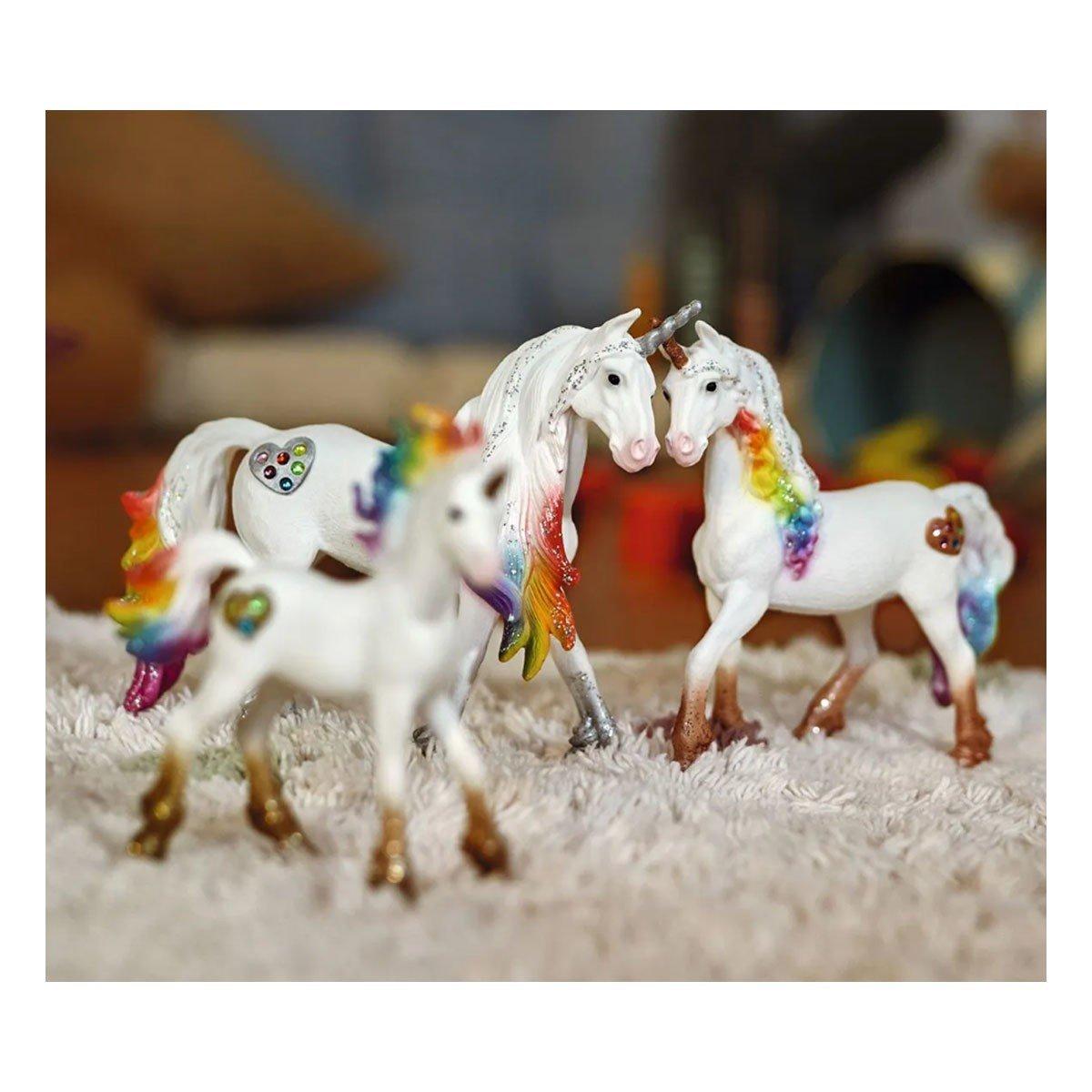 Colorful enchantment bursts into light with the Rainbow Love Unicorn Mare! A pearly white coat and a glittery rainbow mane and tail give this fantasyland creature a magical radiance. A shiny copper-colored horn shimmers and sparkles with delight. Gallop off to BAYALA® aboard the Rainbow Love Unicorn Mare figurine from schleich®.
