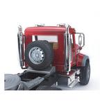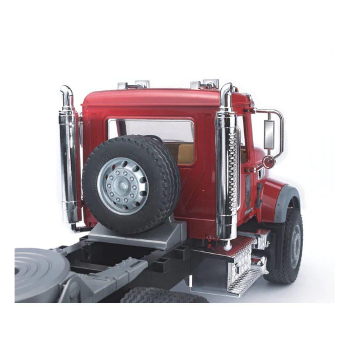 The incredibly realistic driver's cabin features doors that can be opened, a tilting engine hood that provides a full view of the engine block, and folding side-view mirrors. The MACK Granite Flatbed Truck with JCB Loader Backhoe includes a fully functioning fifth wheel coupling, fold-away stabilizers to safely support the vehicle, fold-down access ramps, and adjustable vehicle locks to secure the loaded vehicles. The MACK Granite Flatbed Truck #02813 also includes the JCB loader Backhoe which has a fully functional front loader, a backhoe that moves up and down and swings from side to side on this unique toy, a seat that swings around for optimal views of the worksite, soft rubber tires with real tread and stabilizer legs which extend to the ground.