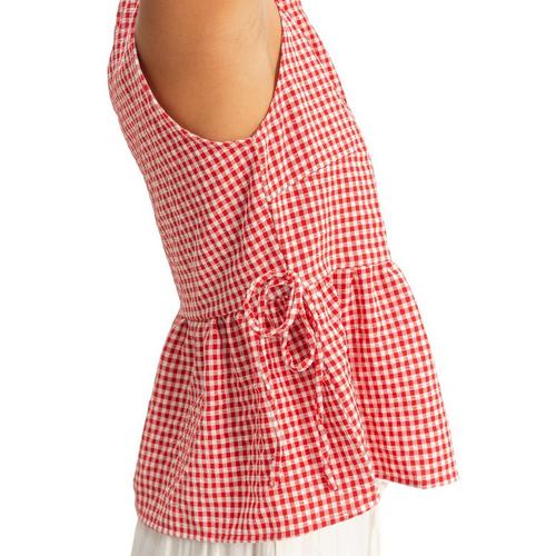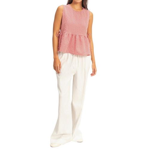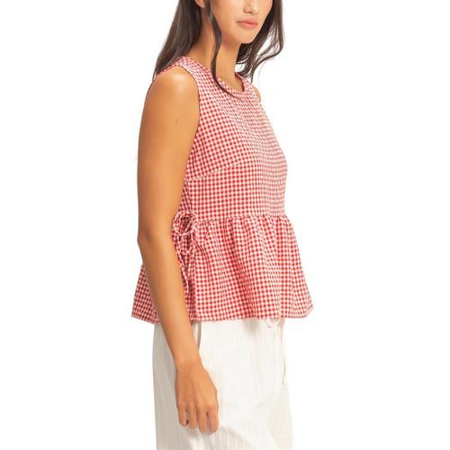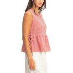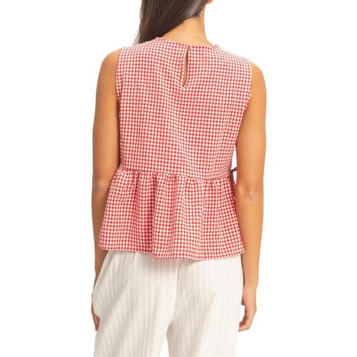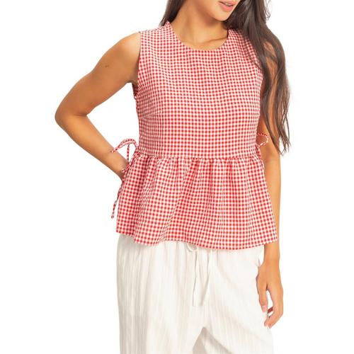 Embrace sunny days with this textured gingham, designed for effortless charm. It features a classic round neckline and a breezy sleeveless cut. The silhouette is defined by a playful peplum hem accented with delicate side tie details. Finished with a back keyhole button closure, pair it with high-waisted denim for a chic daytime look.