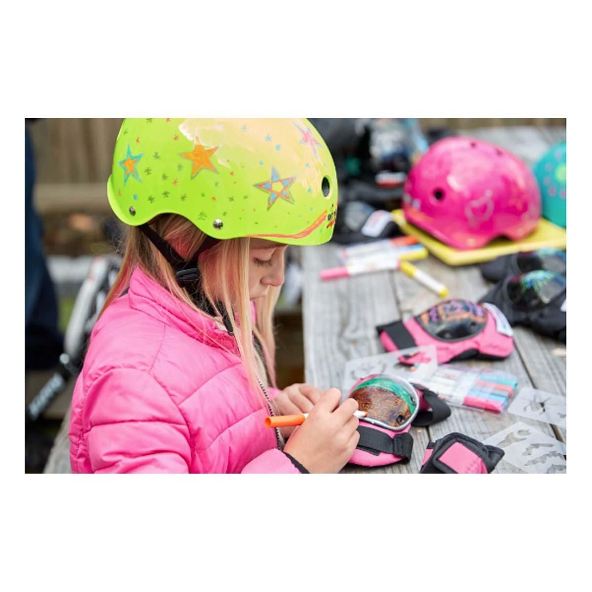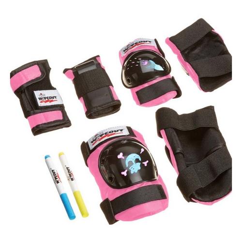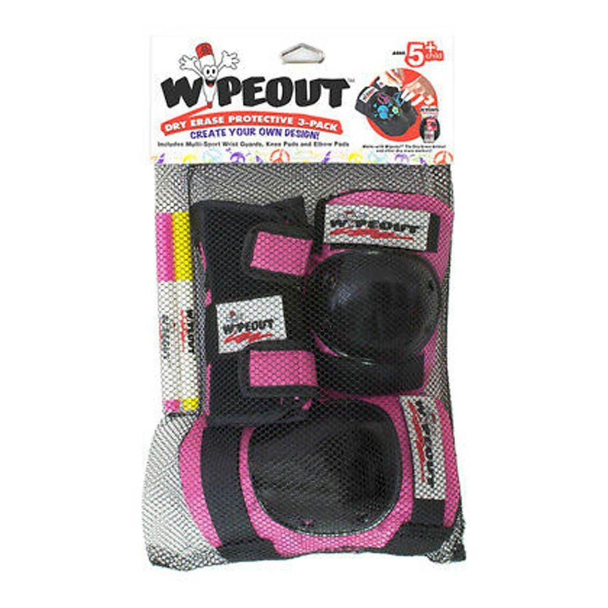 The Wipeout Dry Erase Protective 3-Pack includes multi-sport wrist guards knee pads and elbow pads. Also comes with two neon dry erase non-toxic markers.